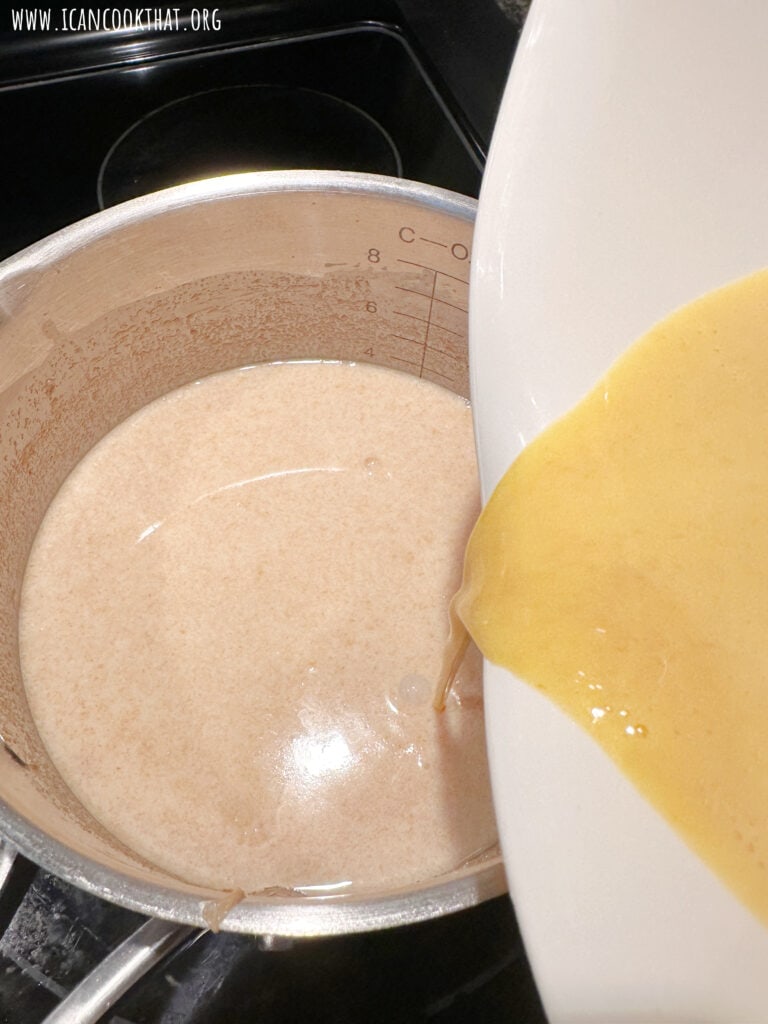 • Pour that mixture back into the pot with the remaining milk mixture and stir constantly until the mixture thickens and reaches between 170 to 175 degrees F.