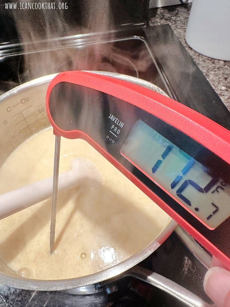 Pour that mixture back into the pot with the remaining milk mixture and stir constantly until the mixture thickens and reaches between 170 to 175 degrees F (using an instant-read digital thermometer like this – paid link).
