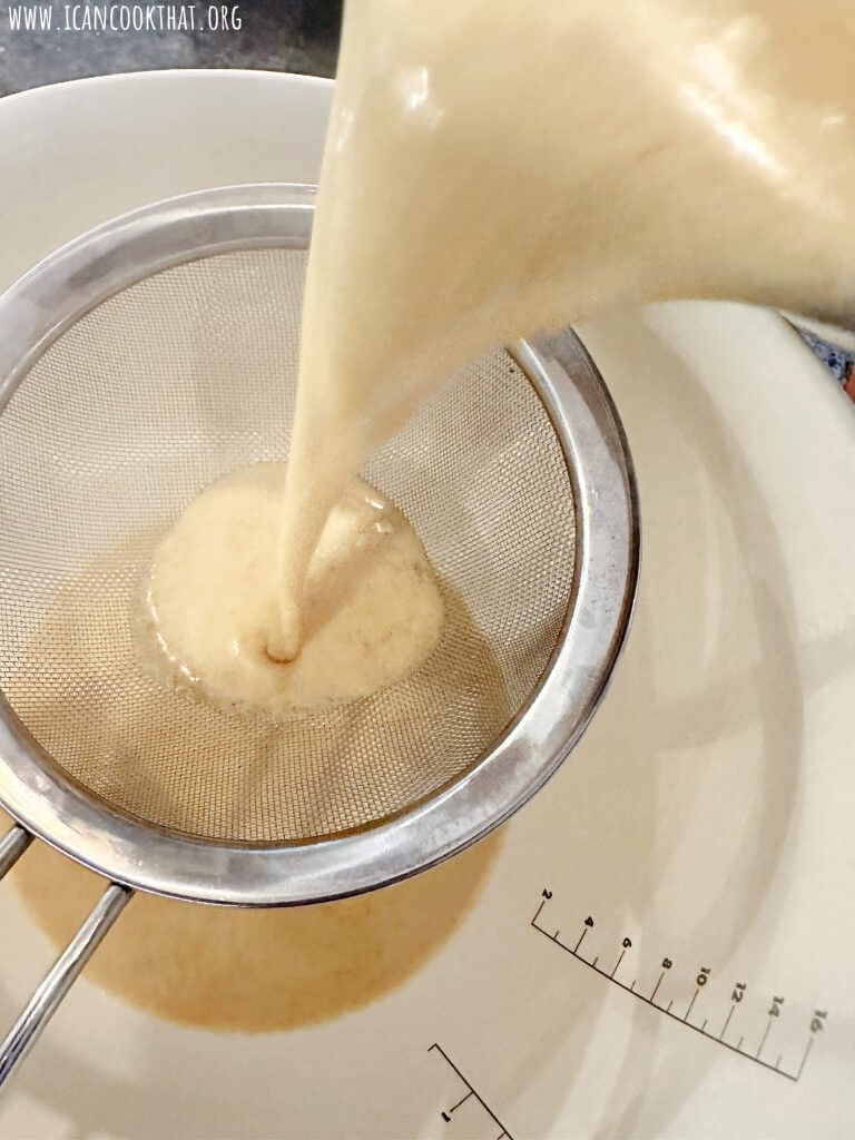 Add a fine mesh sieve (paid link) over a large bowl. Pour the milk mixture through the fine mesh sieve.
