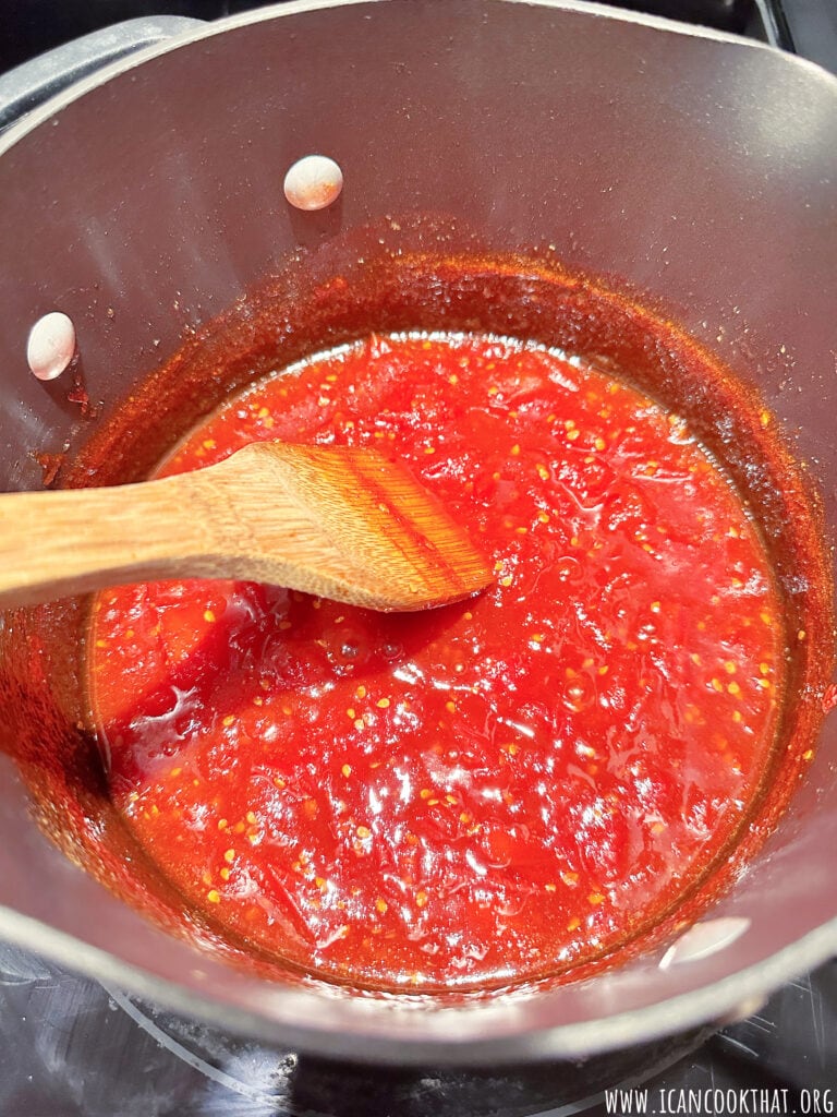 • Reduce your heat to a simmer and cook for about 75 minutes, or until the mixture has the consistency of thick jam. (When you run a spatula through it, the liquid should not immediately cover where you just pulled the spatula through.)