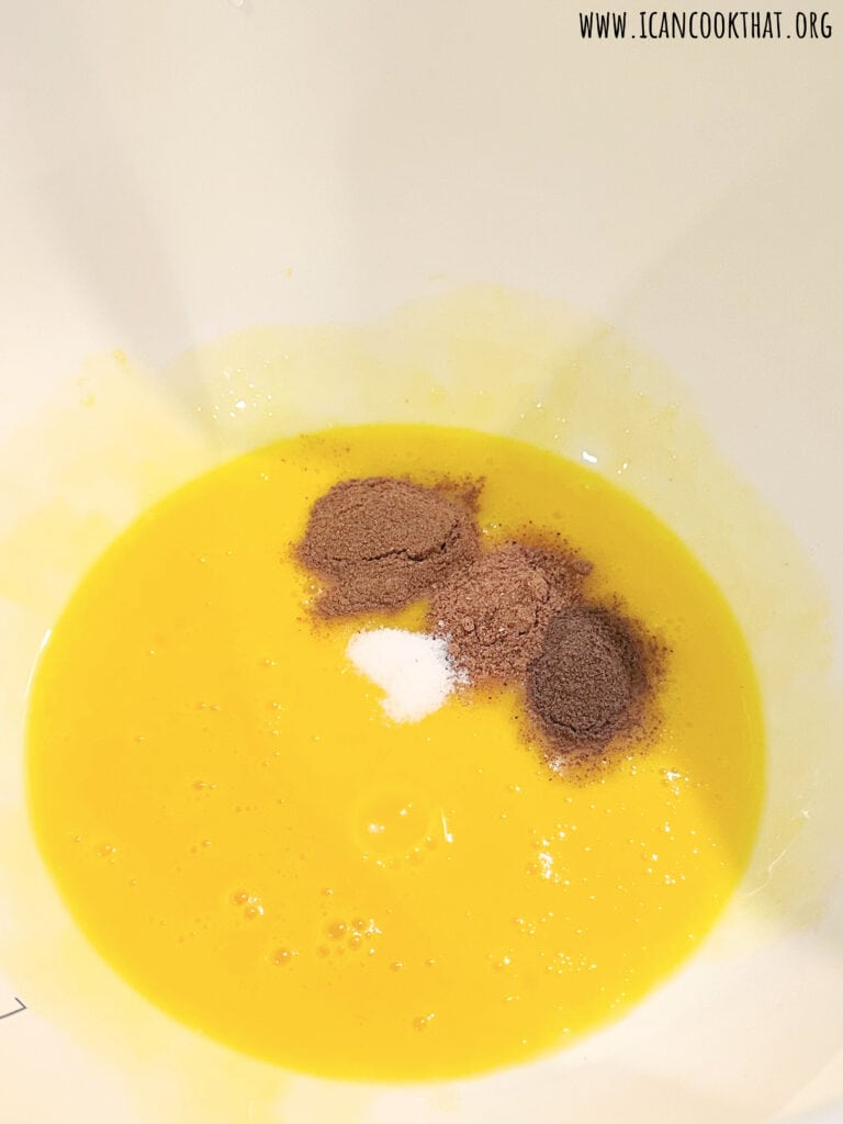 - While waiting for the cream mixture to heat, add 4 egg yolks to a large bowl, whisking to combine. Stir in the cinnamon, nutmeg, allspice, and salt.