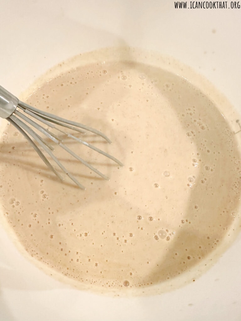 - When the cream mixture is steaming, measure out 1/2 cup of the cream mixture and slowly pour into the bowl with the yolks, whisking as you pour.