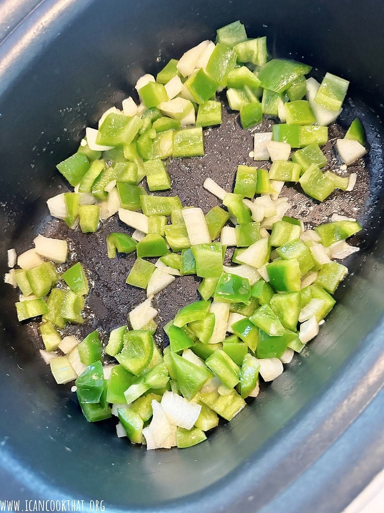 - Add the olive oil to a large saute pan over medium-high heat. Add in your peppers and onion and cook, stirring occasionally, until fragrant, about 5 minutes.