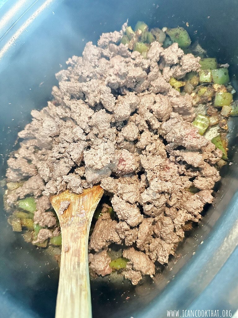 - Add in the garlic, stirring to combine. Add in your chili seasoning and tomato paste, and cook for 1 minute, stirring constantly. Remove from heat and add the mixture to your slow cooker.