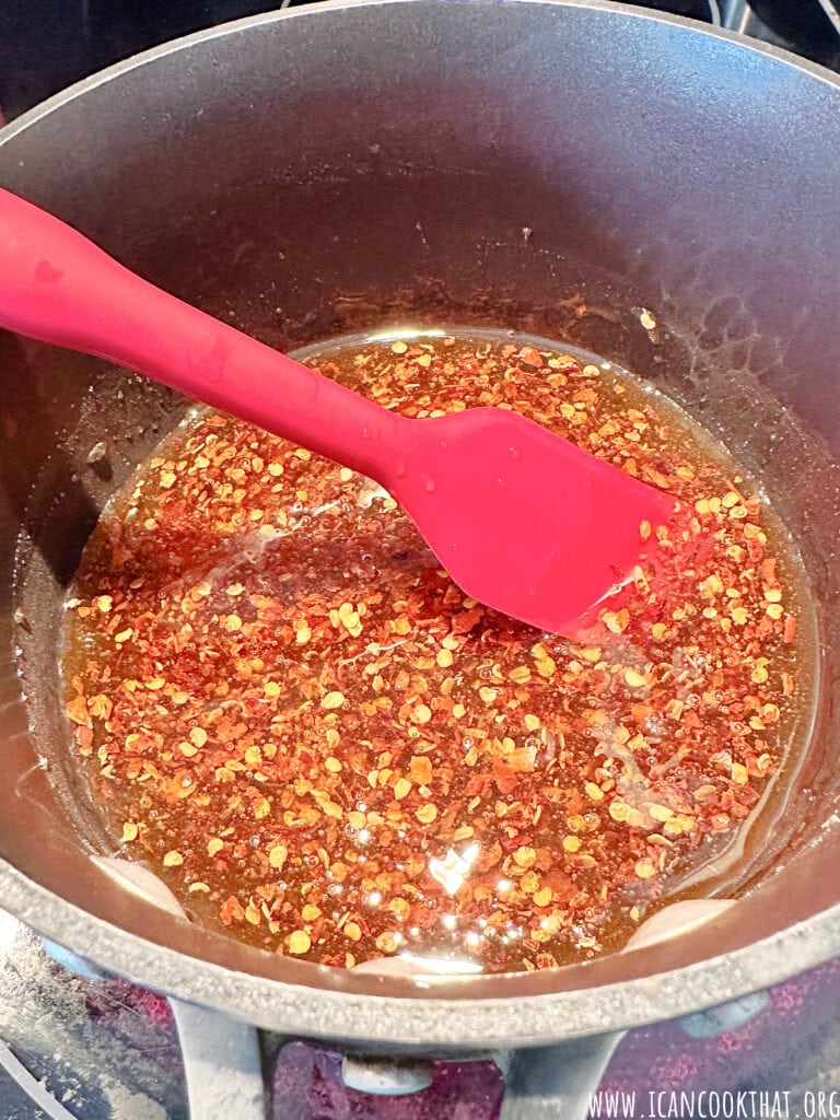 • To make, add the honey and chili peppers or red pepper flakes to a pot over medium heat.
