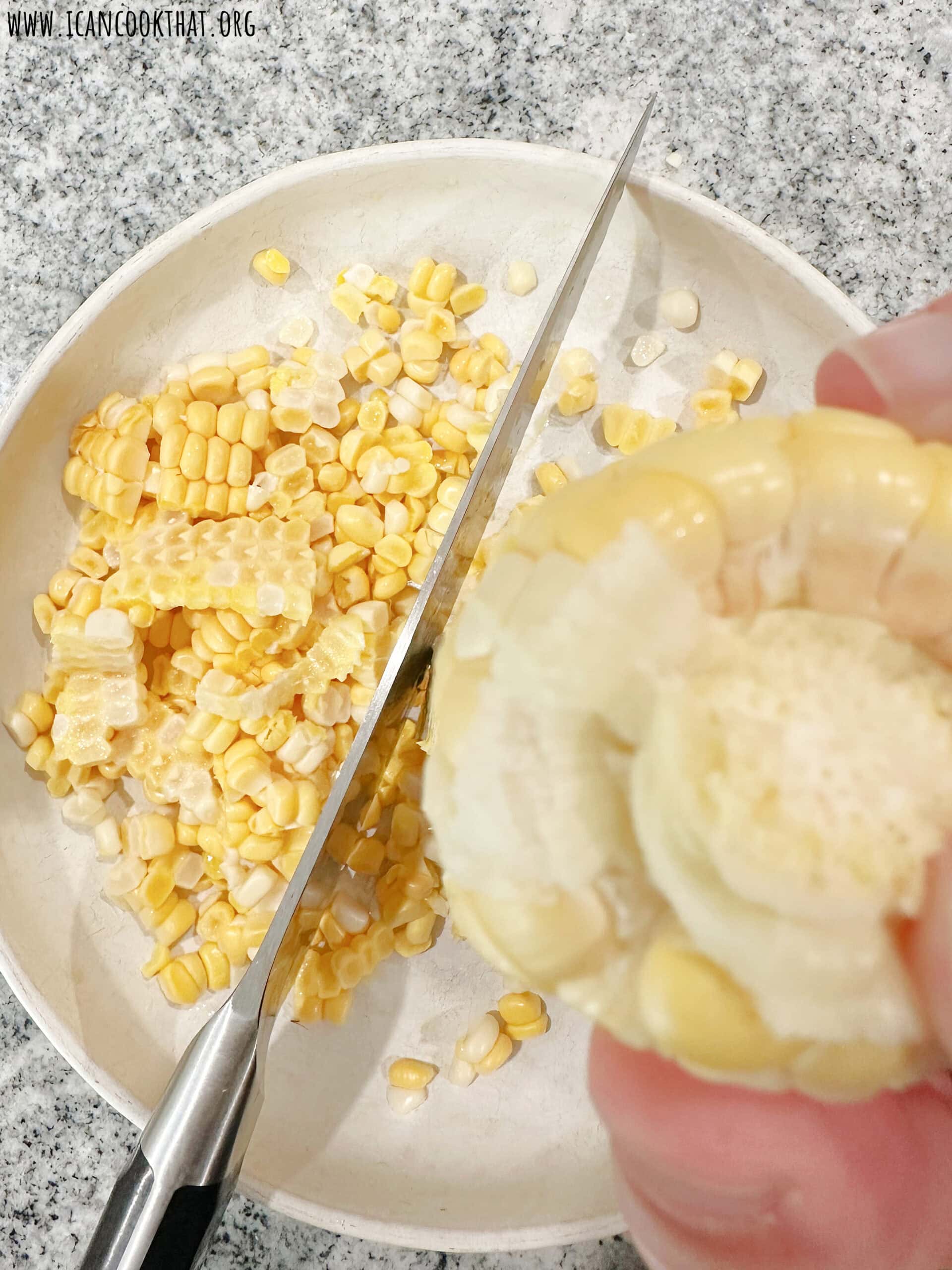 - Remove the corn from the cob with a knife, reserving both the corn kernels and the cobs. Cut your cobs in half and set aside.