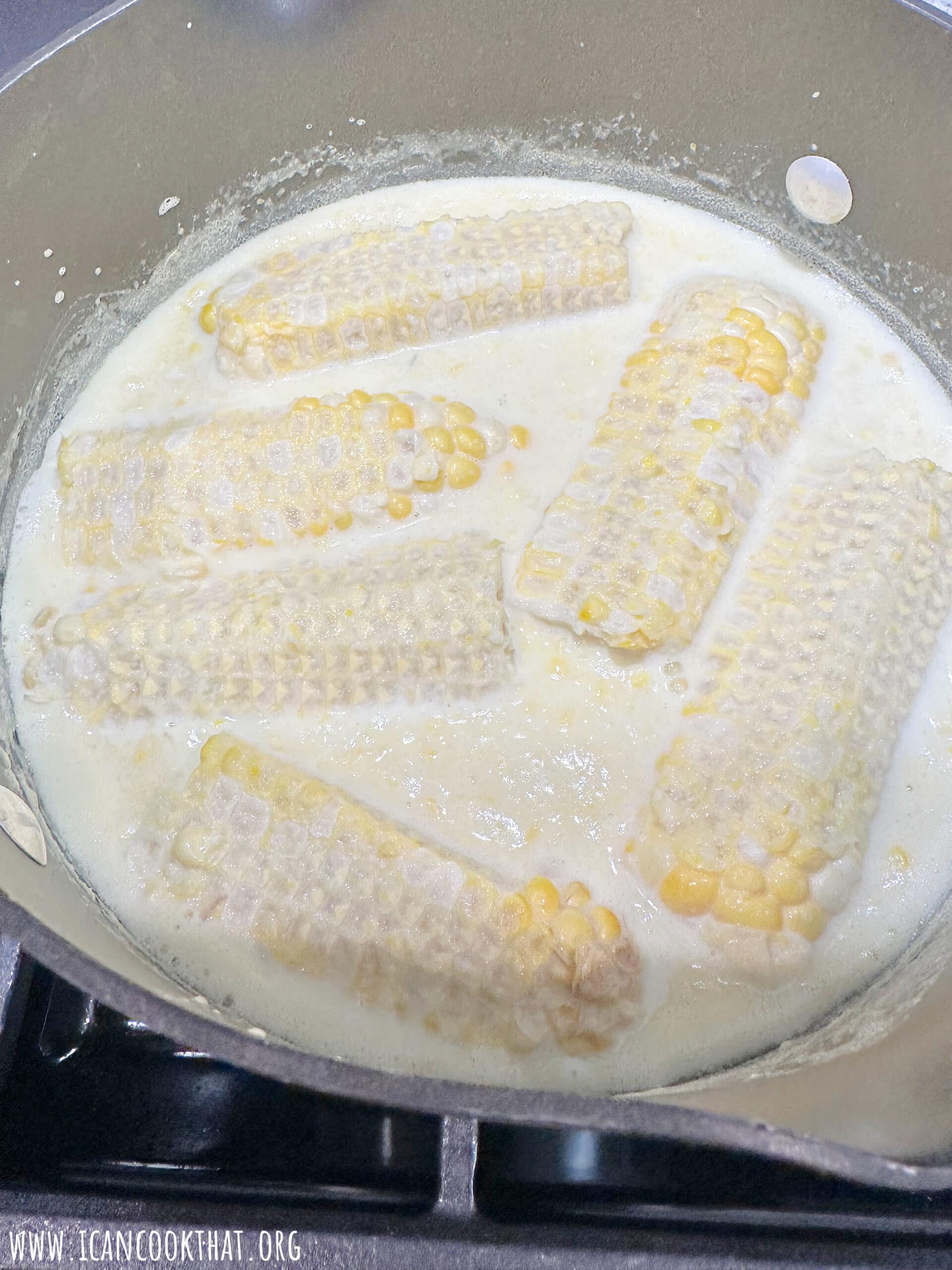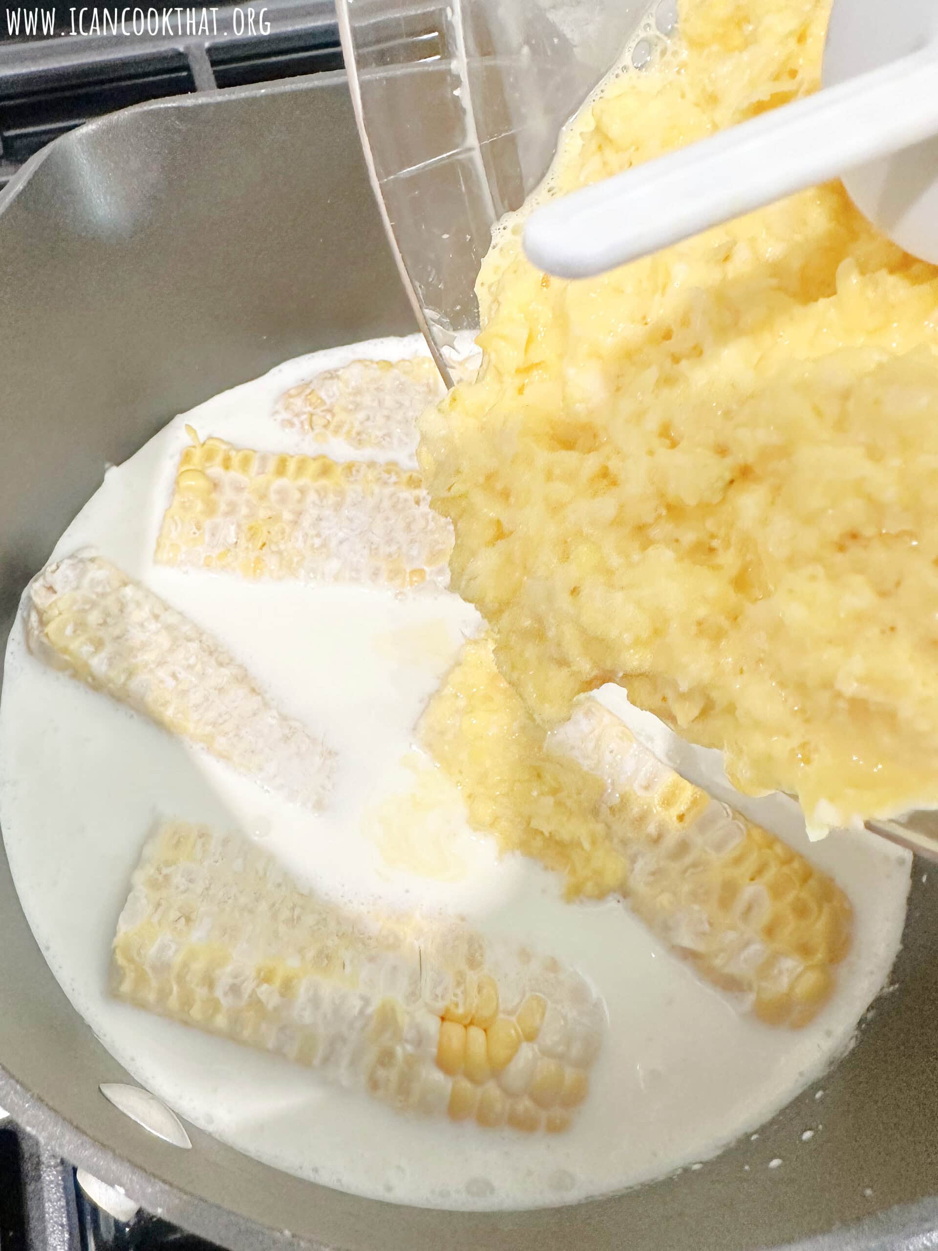 - To a medium-sized pot, add your heavy cream, whole milk, sugar, pureed corn kernels, and as many of the cob halves as your can fit comfortably (I used 6 of the 8 I had).