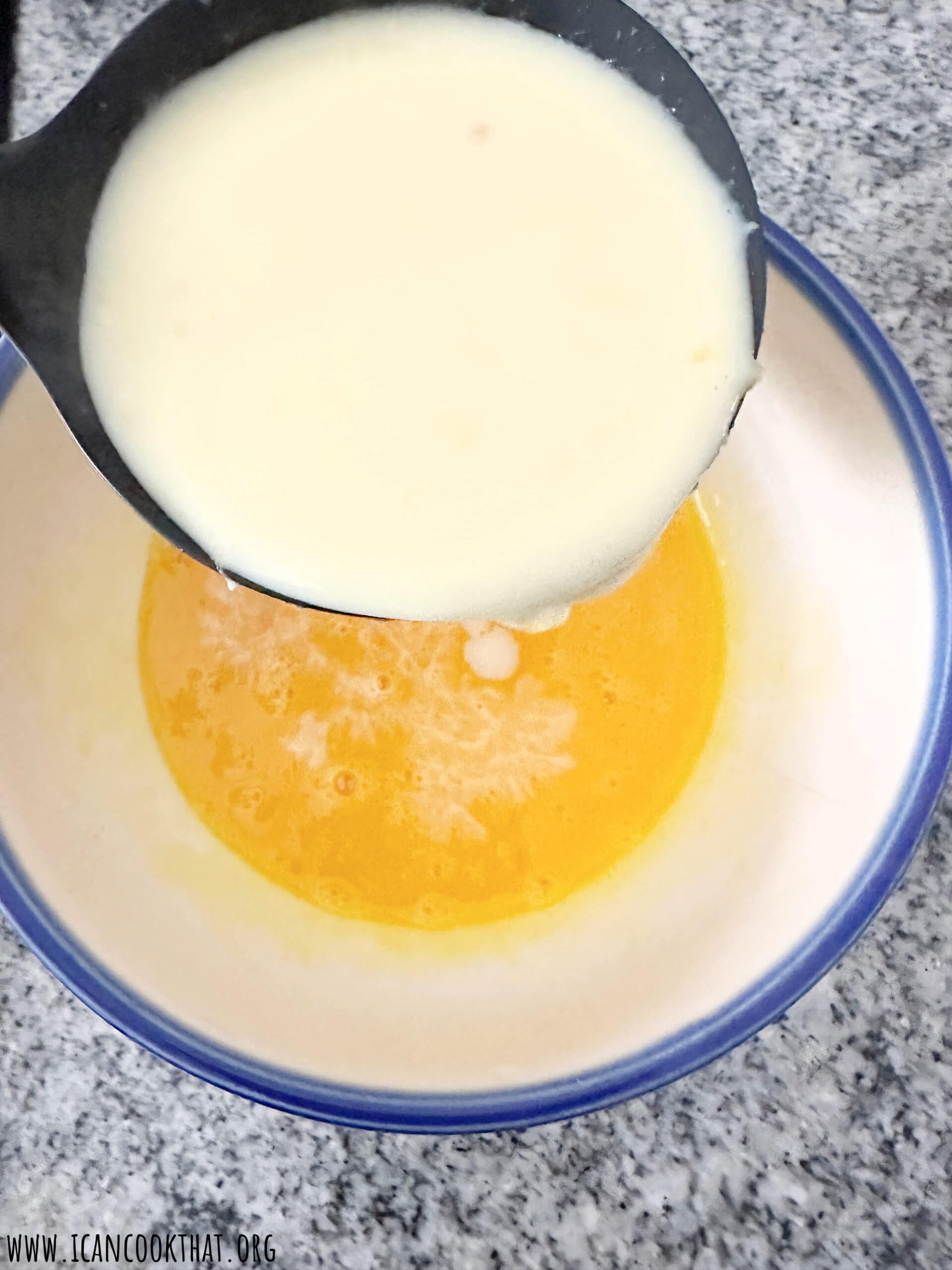 - Ladle out about a 1/2 cup of the steamed mixture and slowly drizzle it into the egg yolks while whisking to combined.