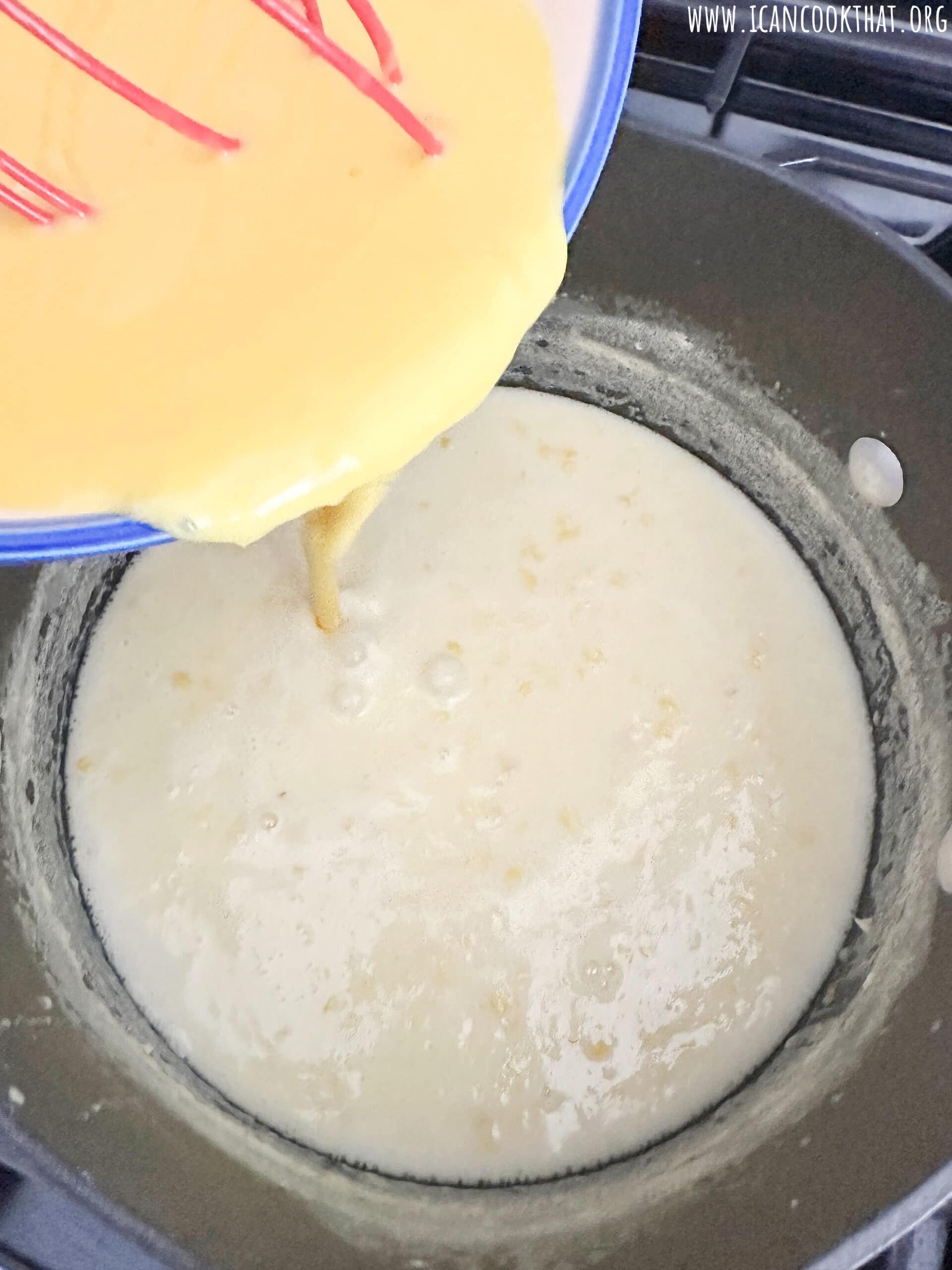- Pour the egg yolk mixture back into the mixture on the stovetop, whisking to combine.