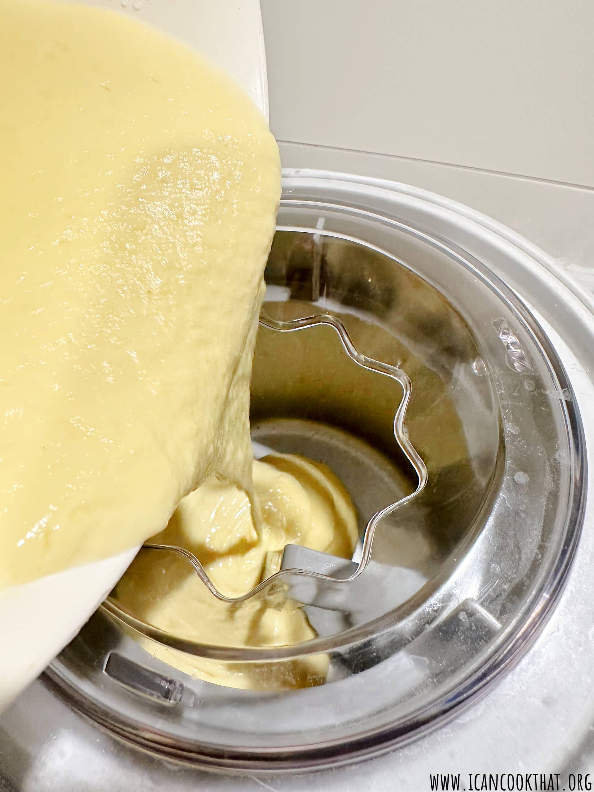 The next day, remove the mixture from your fridge and your ice cream bowl from your freezer. Add the ice cream bowl to the ice cream maker and pour in the cream mixture.