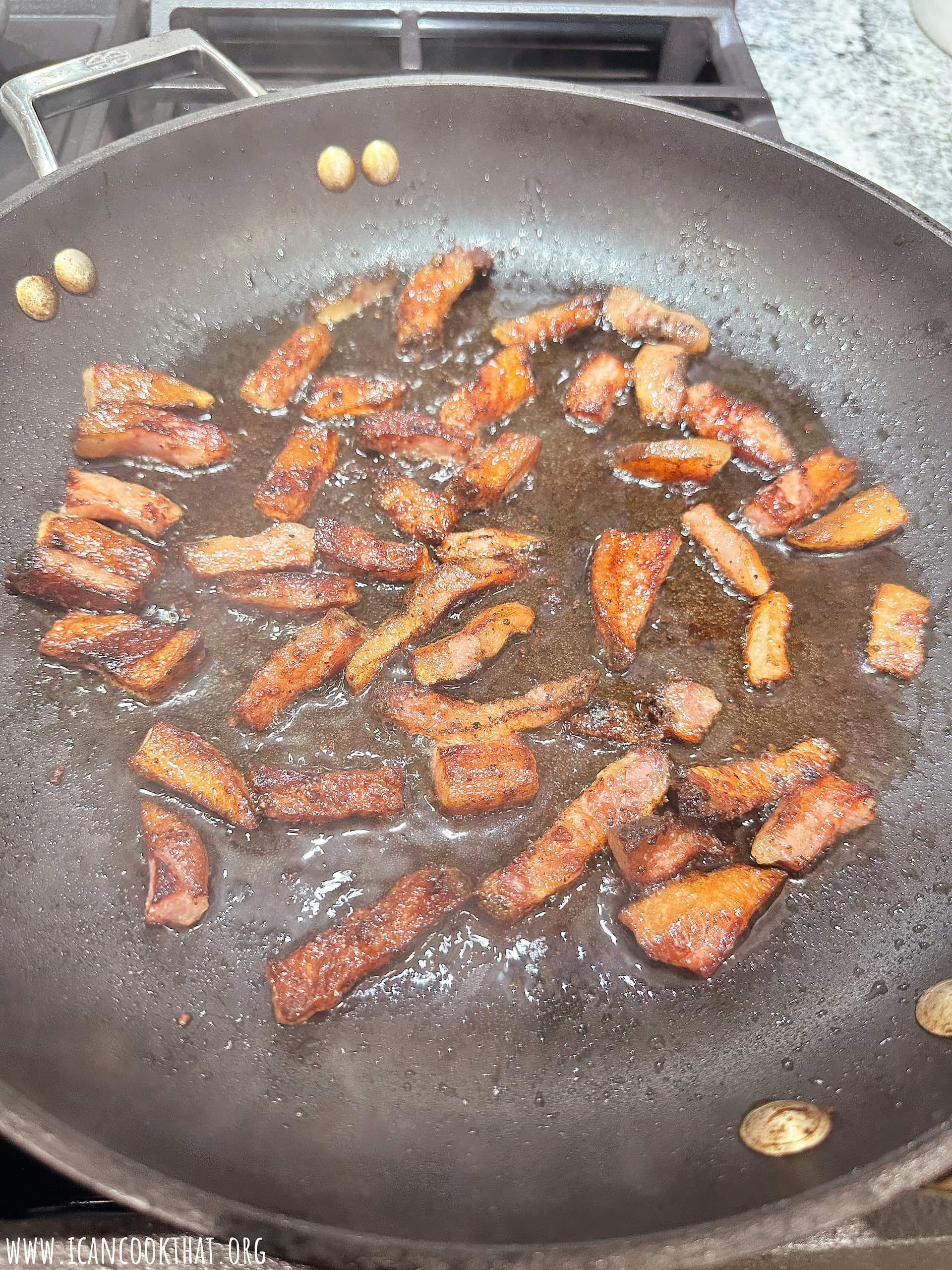 - Remove the cooked guanciale with a slotted spoon, reserving the drippings in the pan.