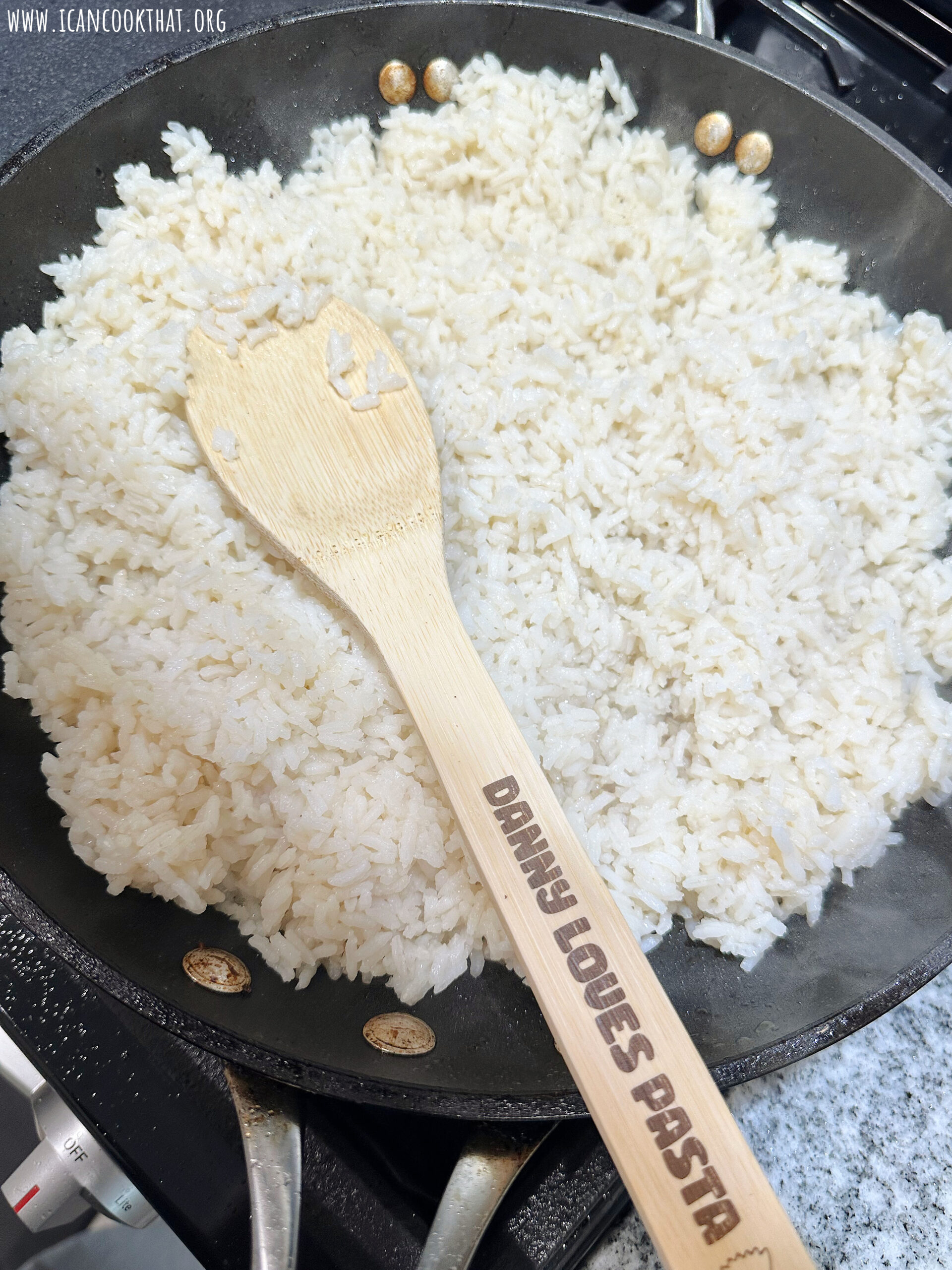 - Add the rice to the skillet, spreading it around to cover the entire surface. Let sit over medium heat until the bottom starts to brown, about 3 minutes.