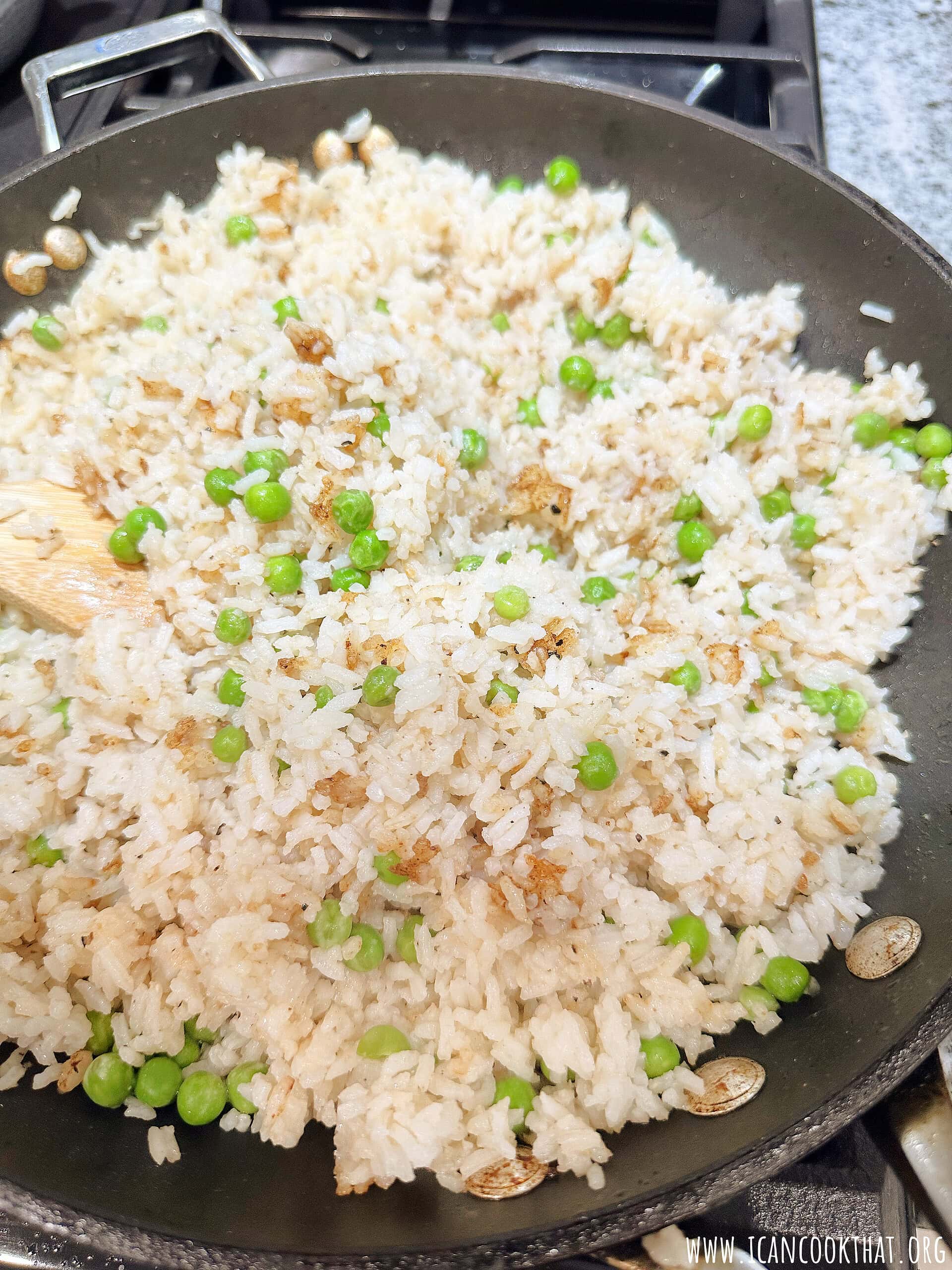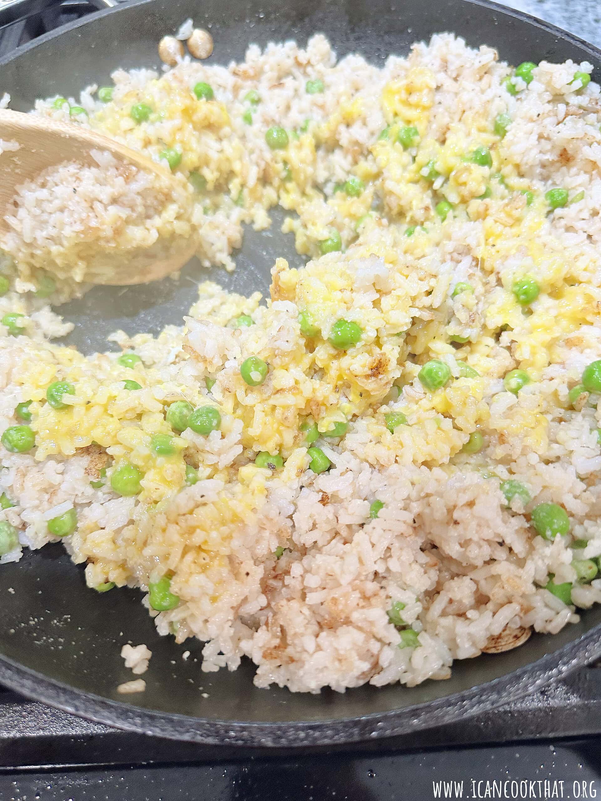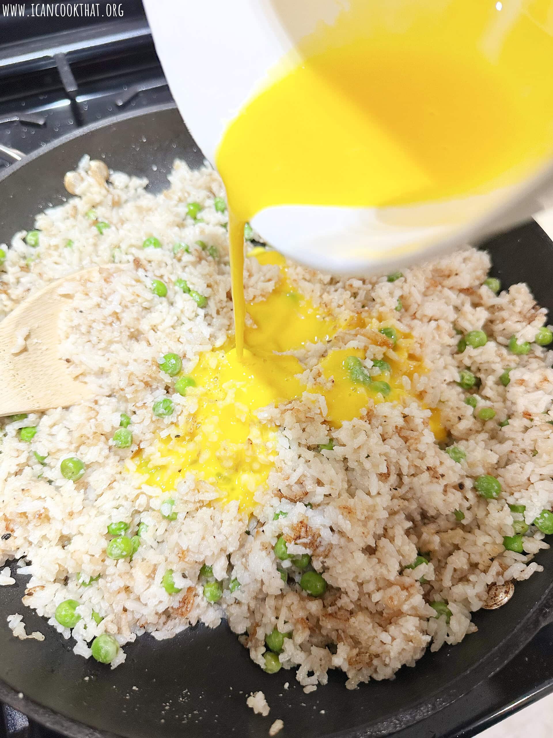 - Pour the egg mixture onto the rice and mix together quickly so the yolks are spread evenly throughout the rice as they cook, about 1 minute.