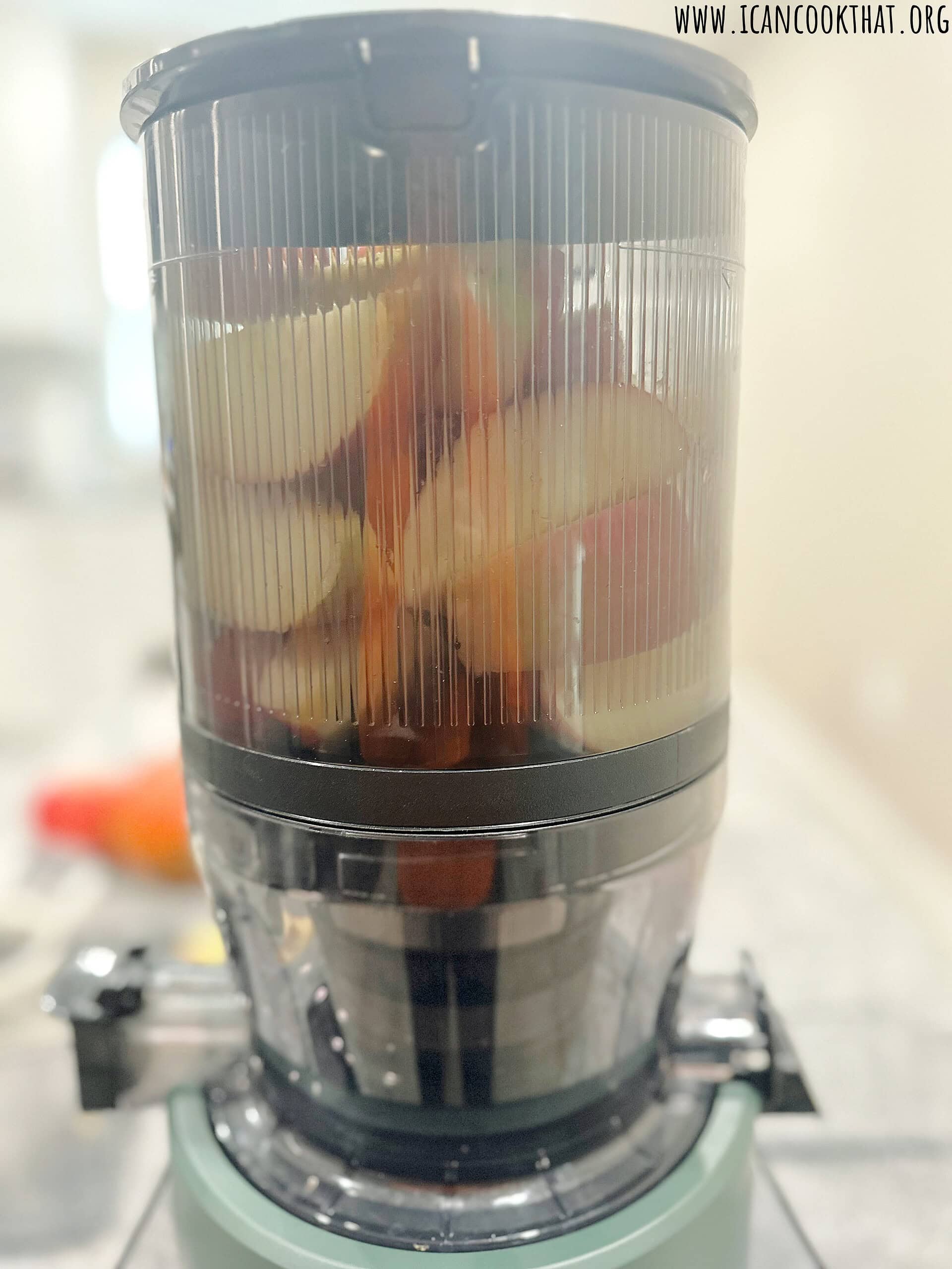 I prefer to use the fine strainer that comes with the Hurom Juicer (paid link) for apple cider. If you want some pulp, use the coarse strainer instead. Set up your juicer and position the juice container on the left and the pulp container on the right of the juicer underneath the spouts.