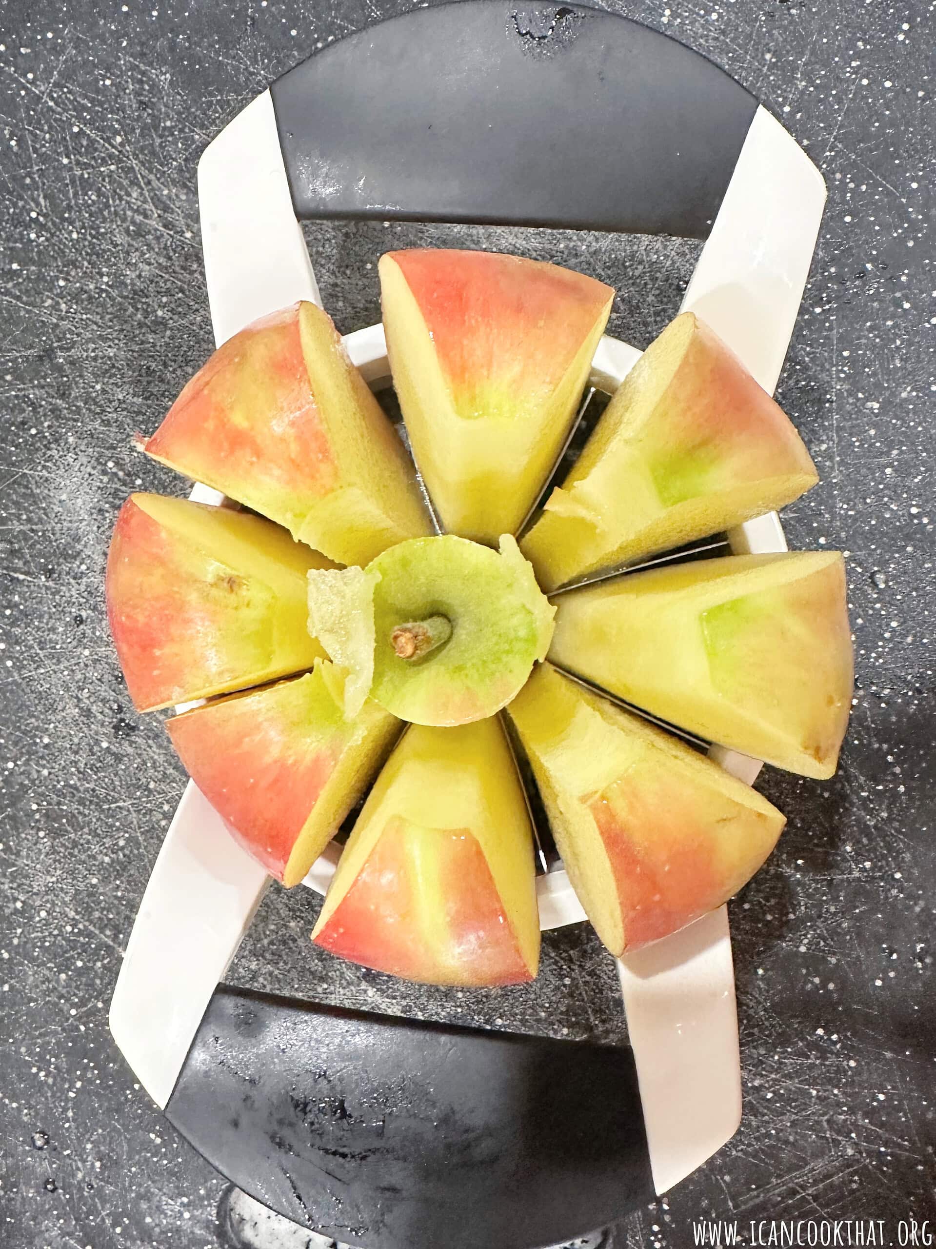 To make your Fresh Juiced Apple Cider, first core and slice (paid link) your apples.