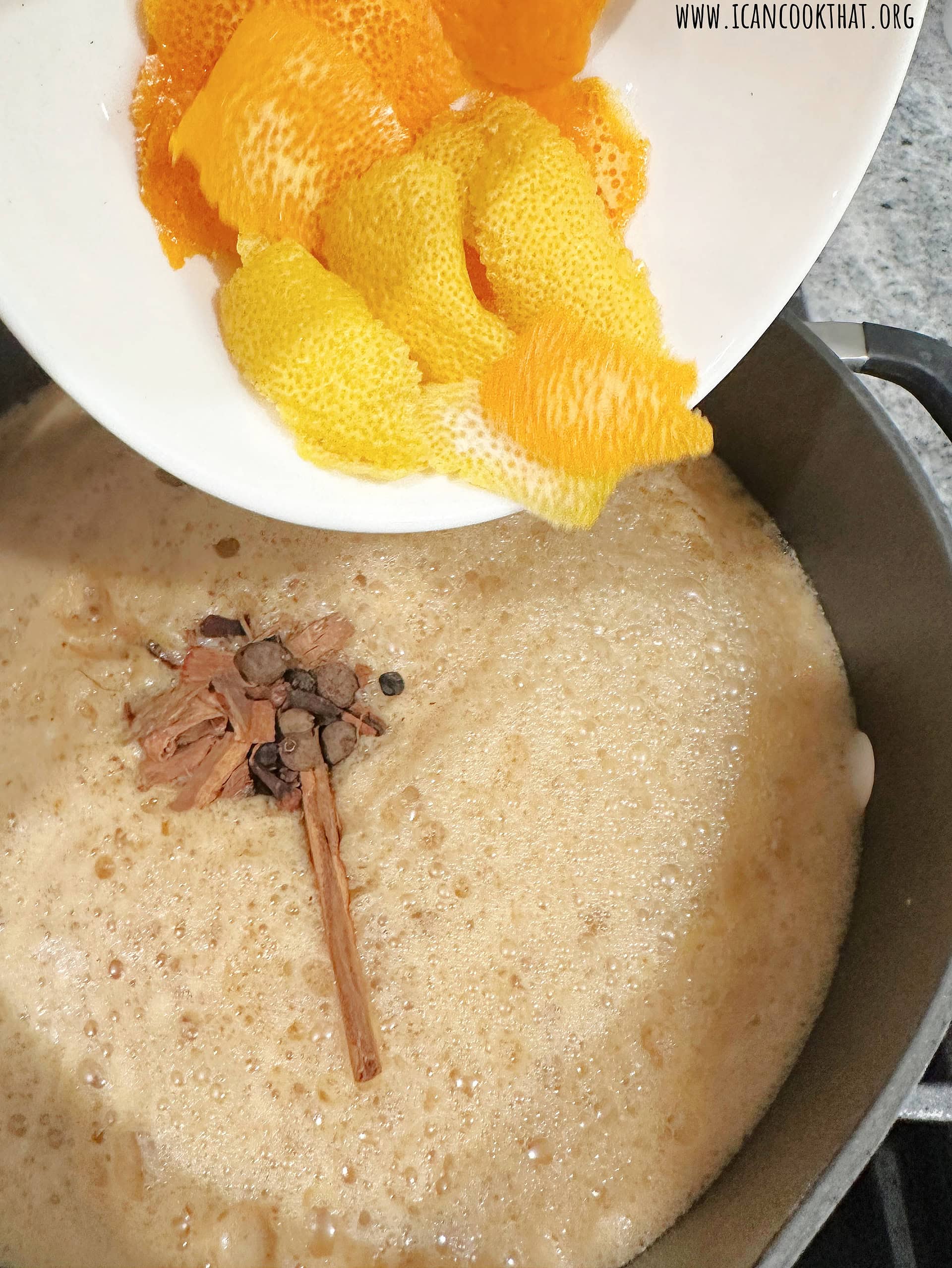 • Add in your spices (peppercorns, allspice berries, cloves, cinnamon sticks) and vanilla extract.