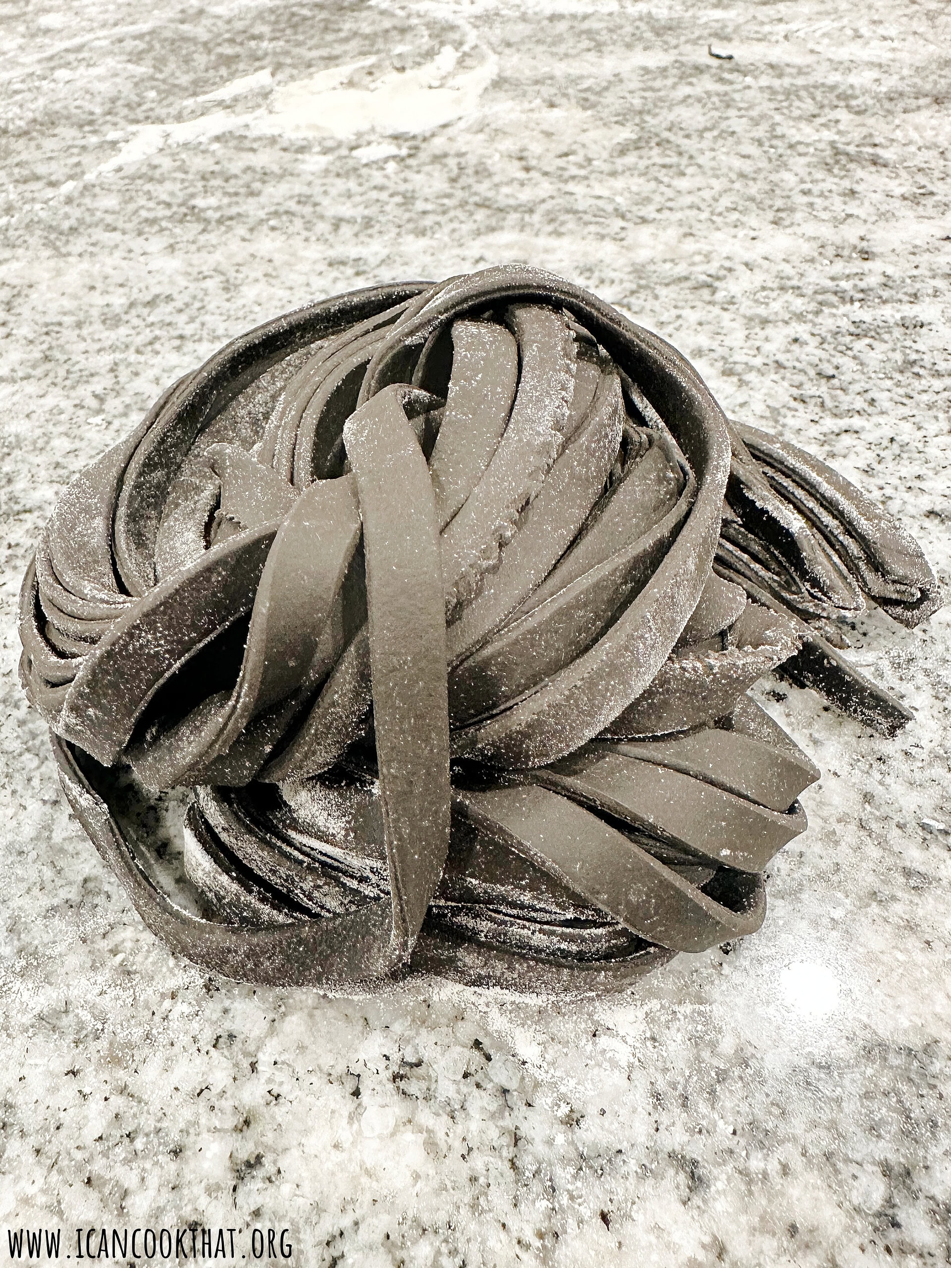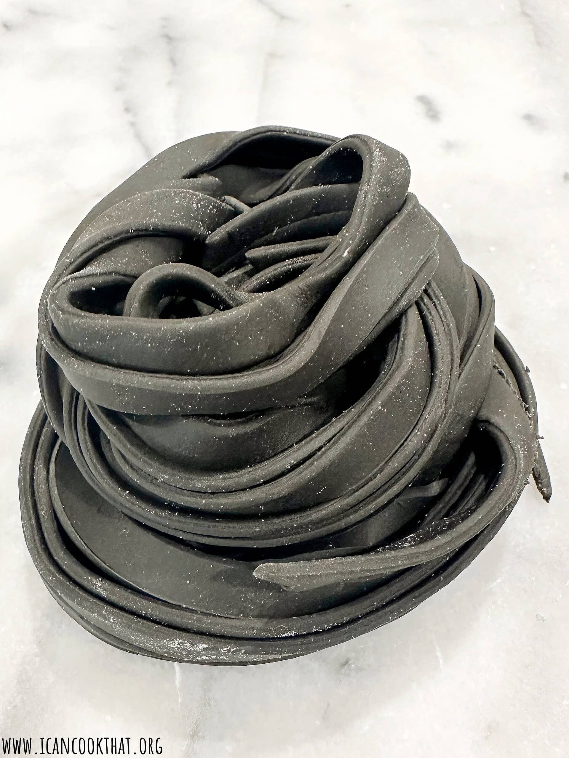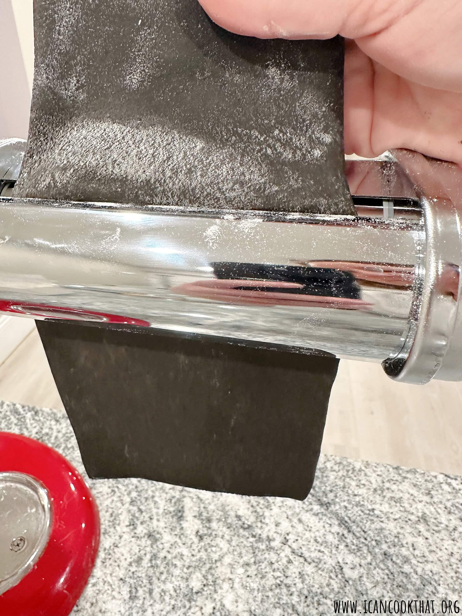 - Feed the dough through, catching the dough with your other hand as it feeds through the machine. You now have homemade squid ink fettuccine!