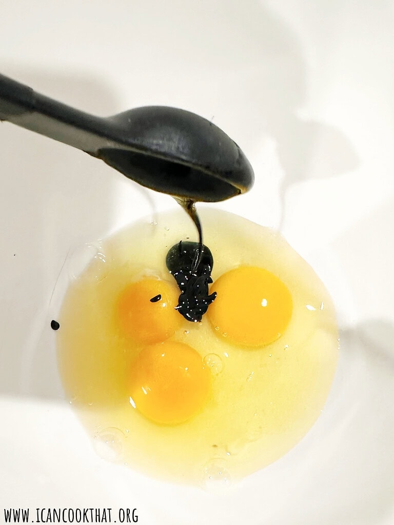 - Whisk together the eggs and cuttlefish ink until mostly combined.