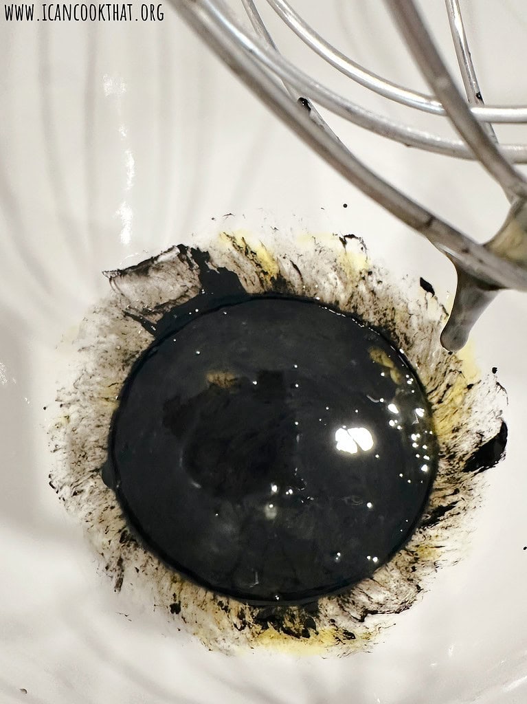 To make your squid ink fettuccine, add your eggs to a medium sized bowl (or the bowl of a stand mixer – paid link) along with the cuttlefish ink.