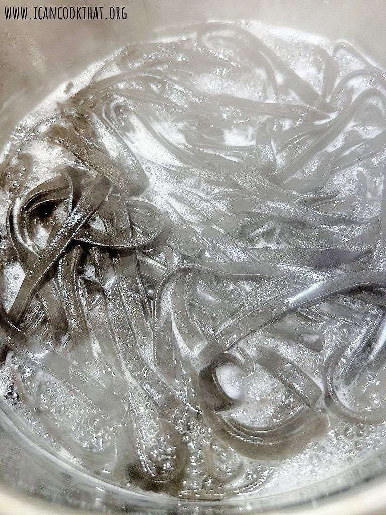 - When ready to cook your squid ink fettuccine, add a large pot of water over high heat and bring to a boil. Season the water with salt, then add in the fettuccine. Cook, stirring to keep the fettuccine separate, for 3 minutes, or until the pasta rises to the surface.
