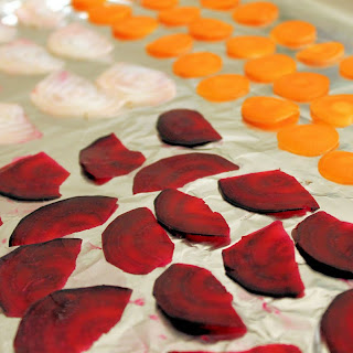 - Preheat the oven to 325 degrees. While the beets are soaking, use a mandoline slicer to thinly slice the carrots. After 15 minutes, remove the beets, dry them off with a paper towel, and thinly slice with the mandoline slicer. Arrange on a baking sheet sprayed with cooking spray and season with salt and pepper.