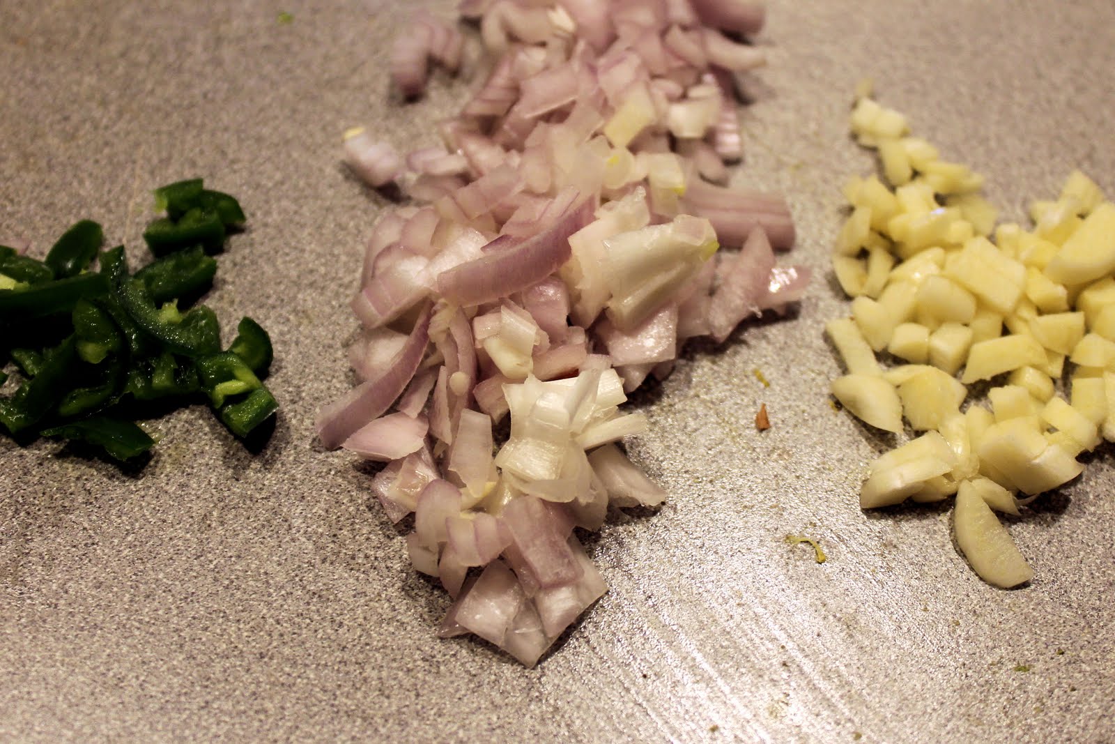 While your rice is cooking. prepare your shallots, garlic and chile. I am a wimp about heat and serraro chile can really be hot, so I removed all seeds before chopping. If you like spicy food, keep the seeds in.
