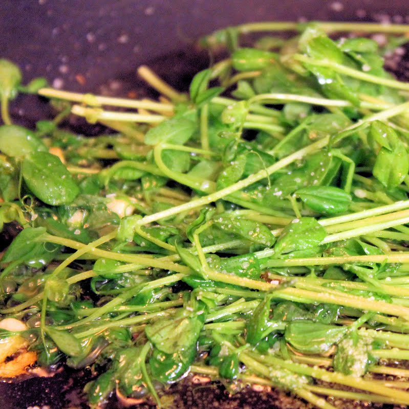You can either remove the garlic, or keep it in there to add more garlicky flavor. Add the pea tendrils and salt to taste.
