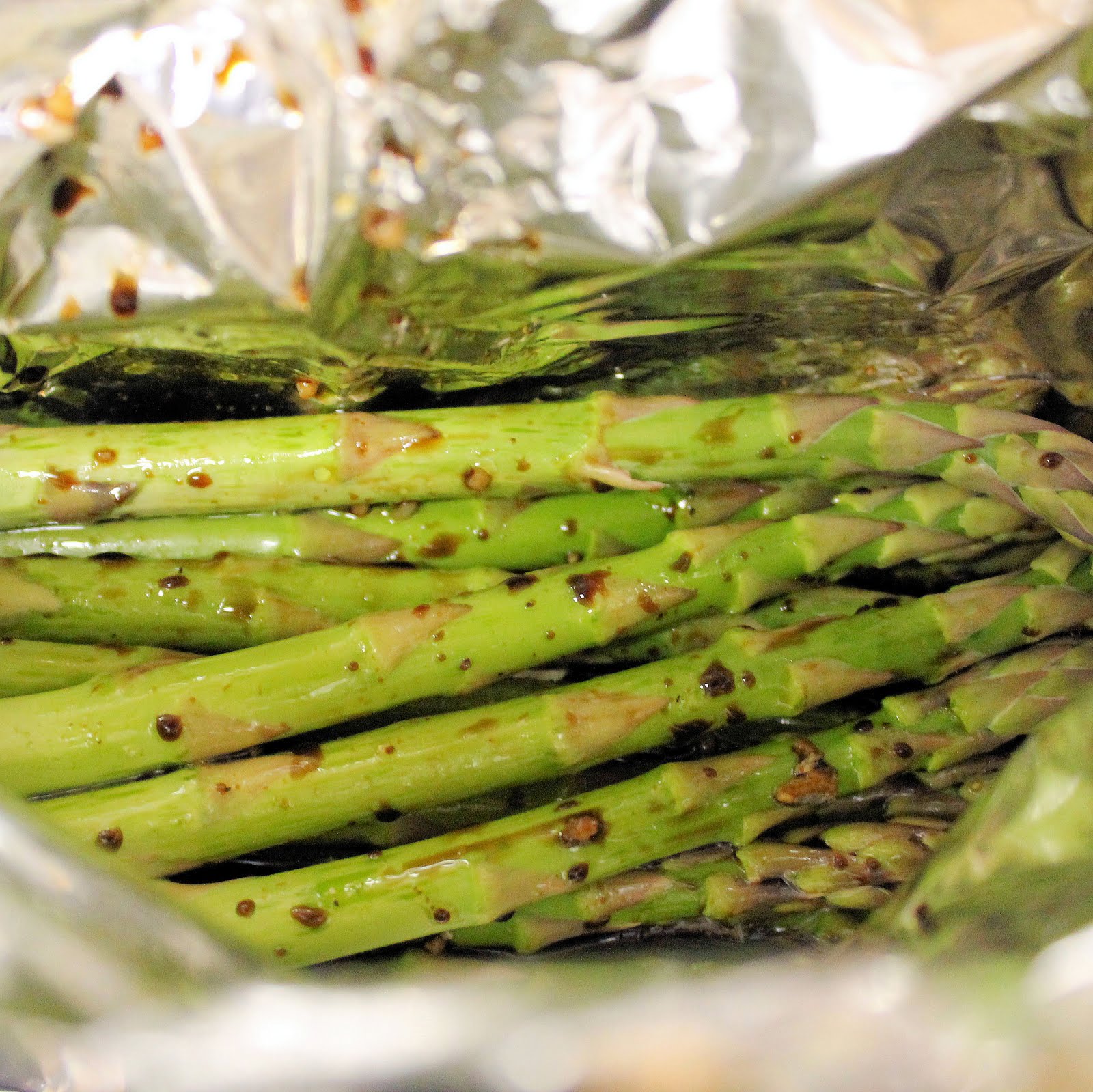 - Close the foil and marinate for at least one hour. You can either remove the asparagus from the foil and place the asparagus right on the grill, cooking for 6-8 minutes, turning carefully half way through, or you can put the asparagus on the grill in the foil, cooking for about 10 minutes. Either way, grill until the asparagus is tender but still has a crunch to it.