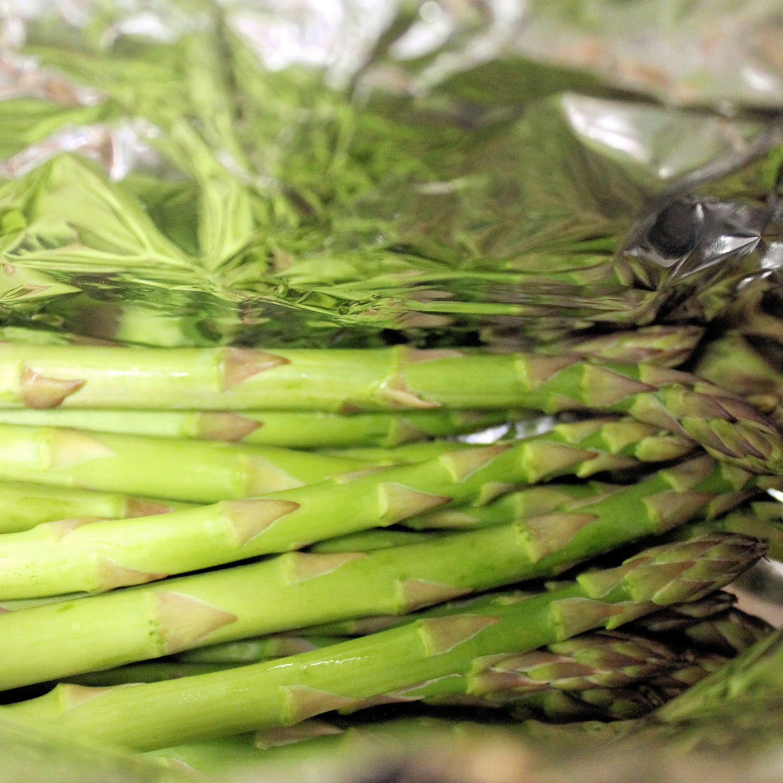 - Place the asparagus on a large piece of tin foil. You will make a little packet out of the tin foil.