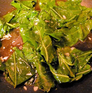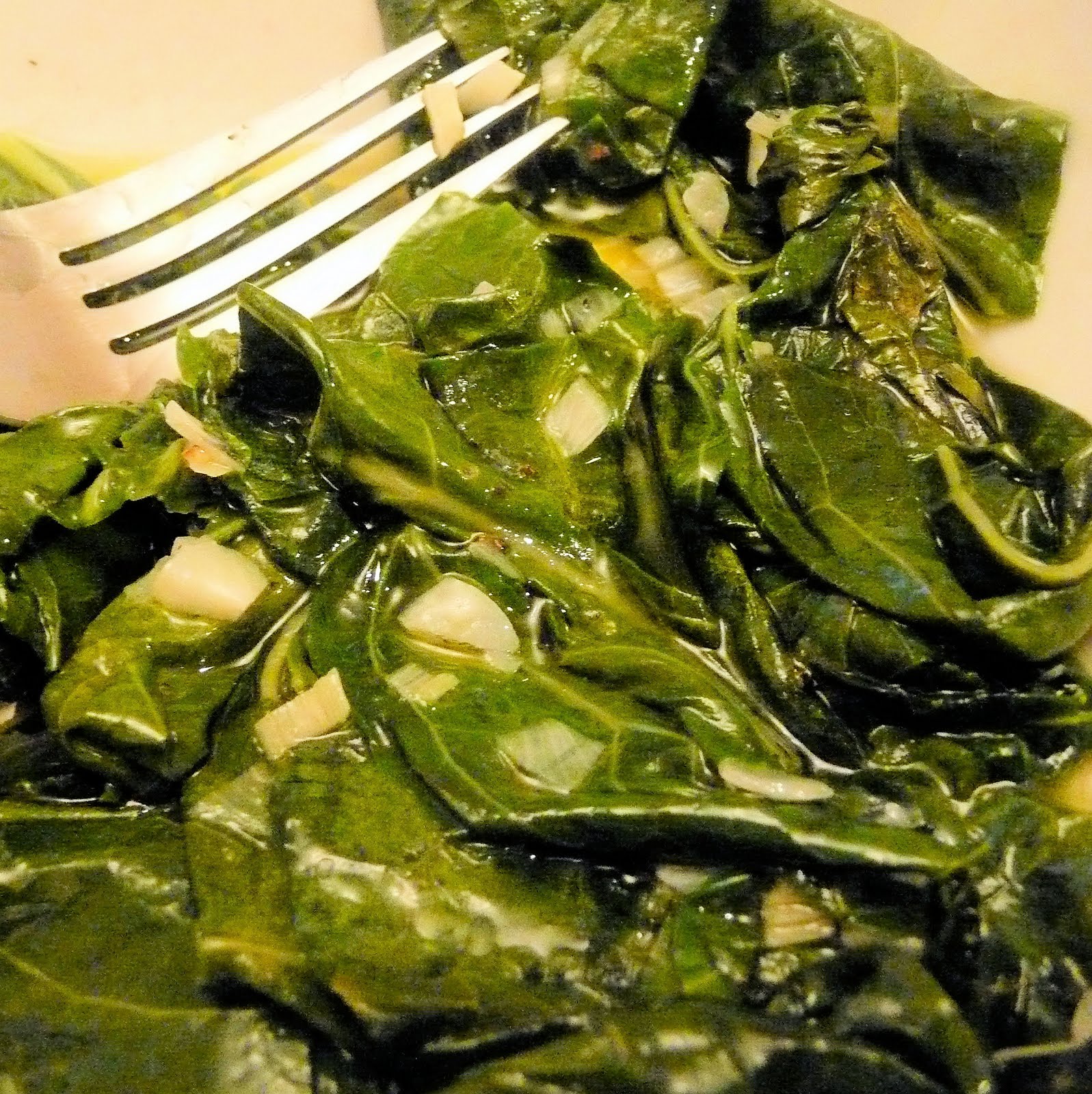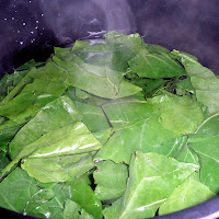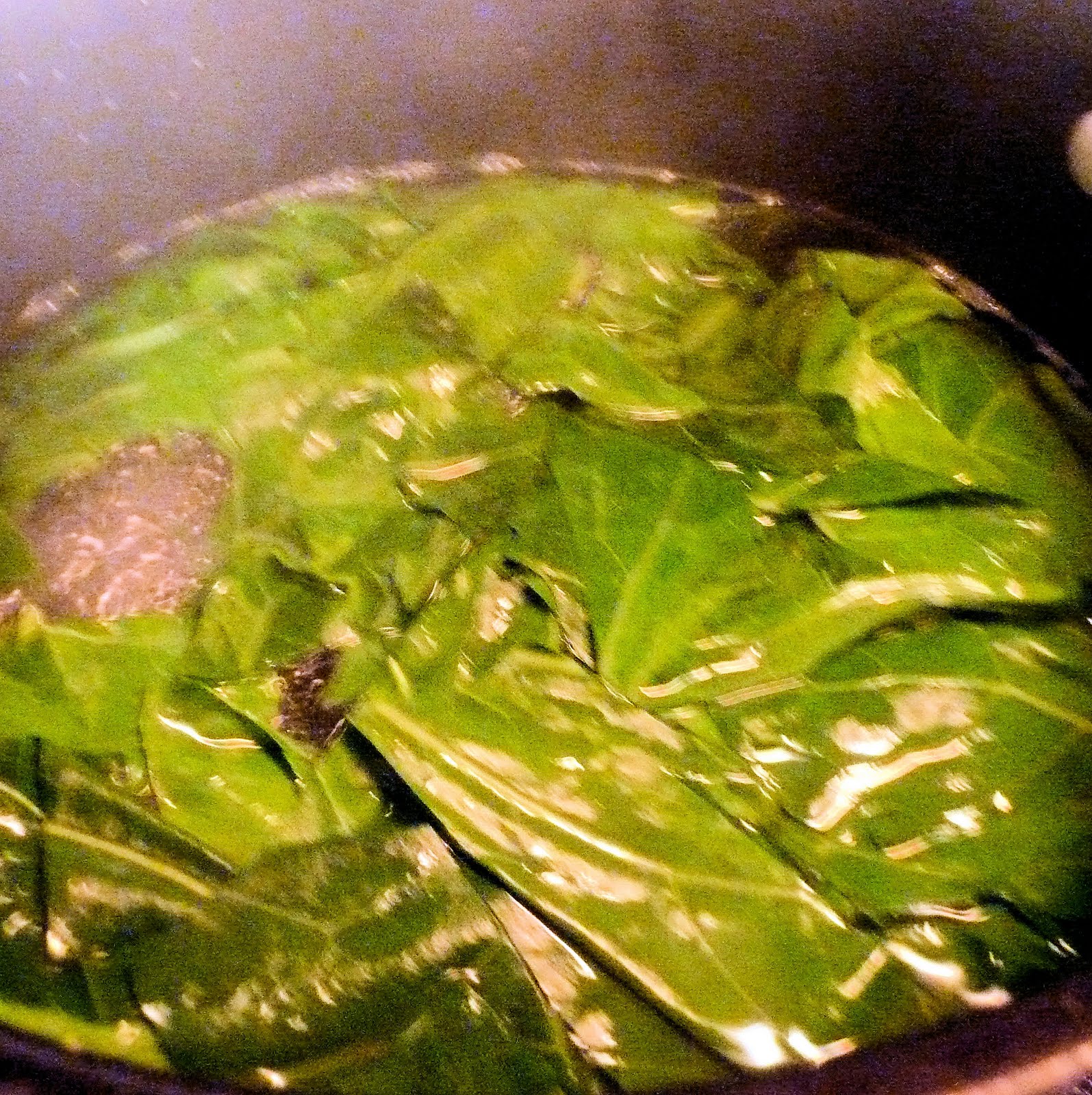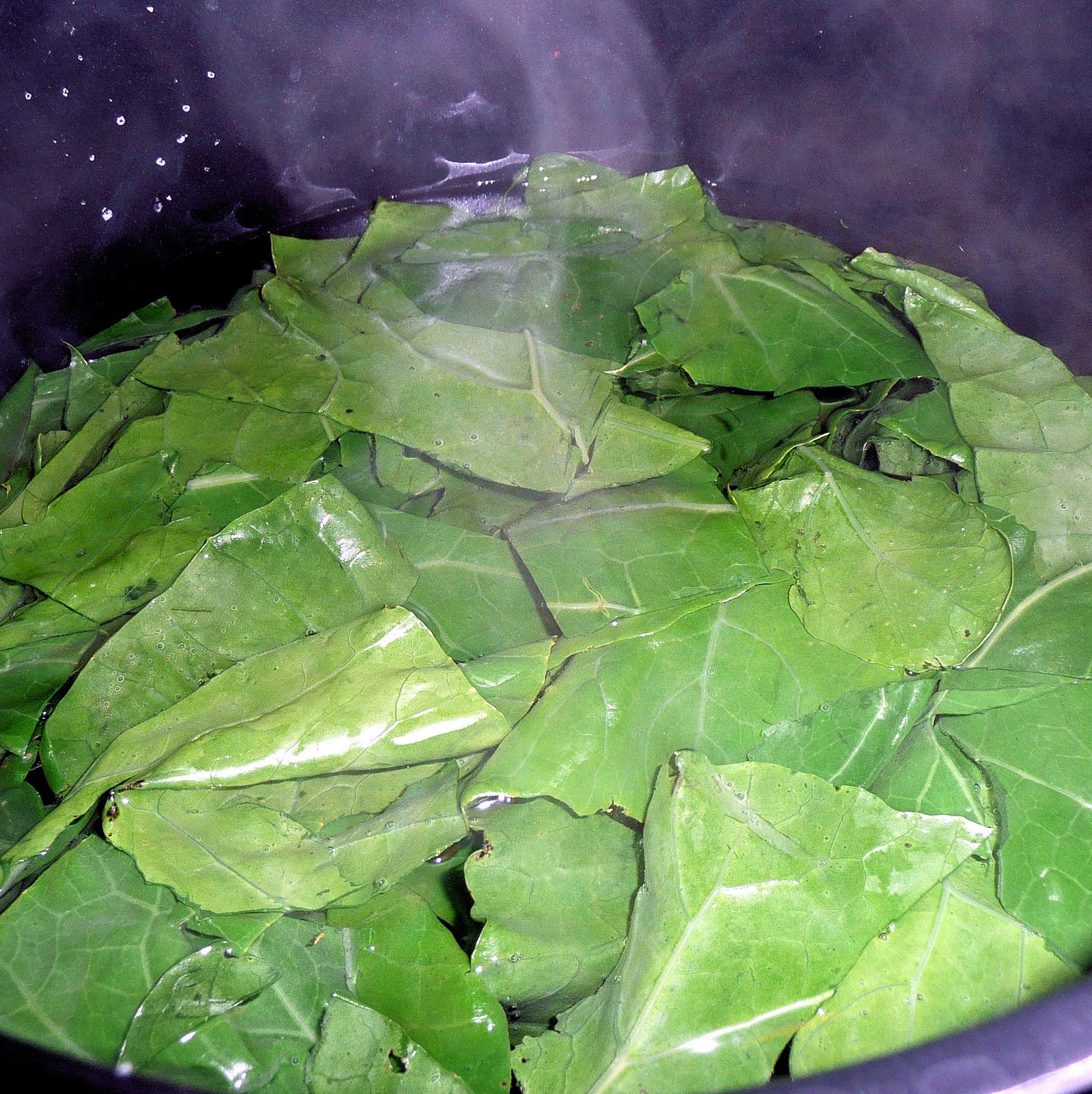 When the water is boiling, add the collard greens and cook for ten minutes.