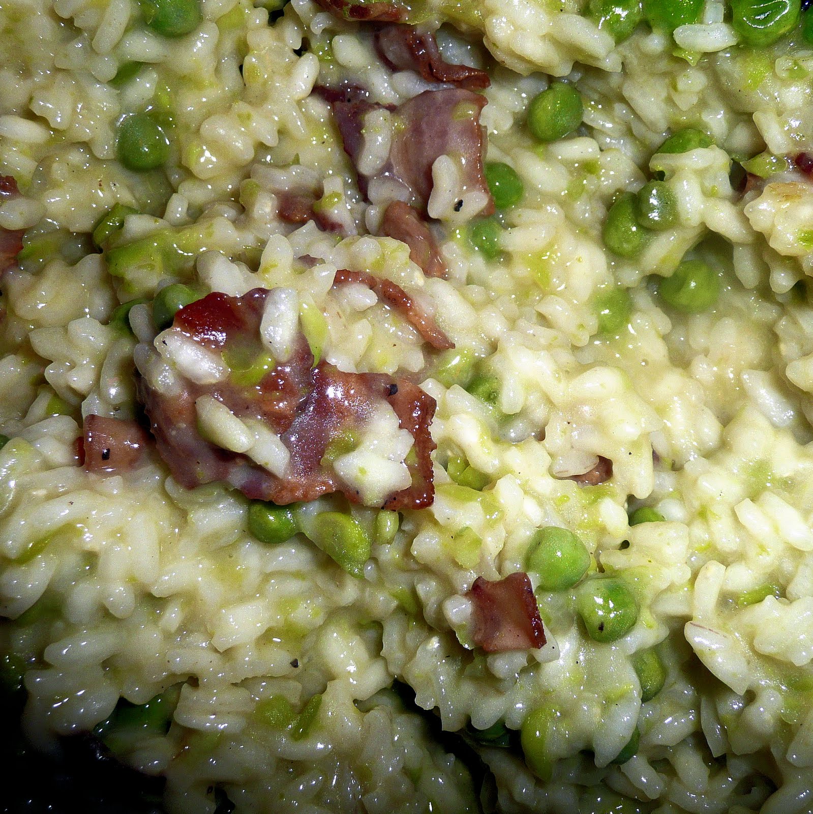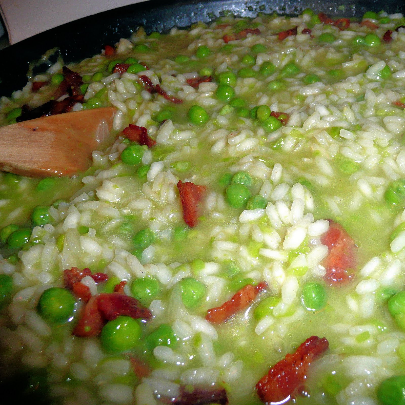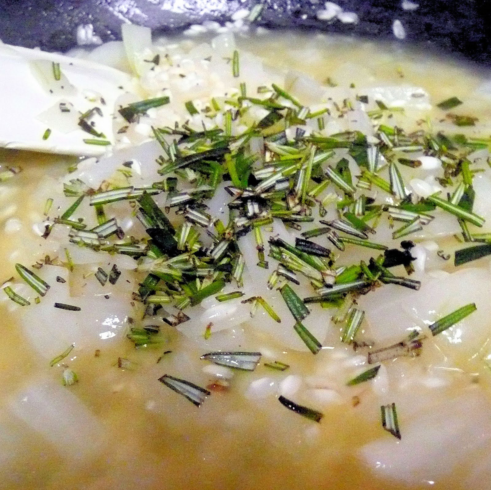 Stir in the crumbled bacon, broth, water, wine, and vinegar.
