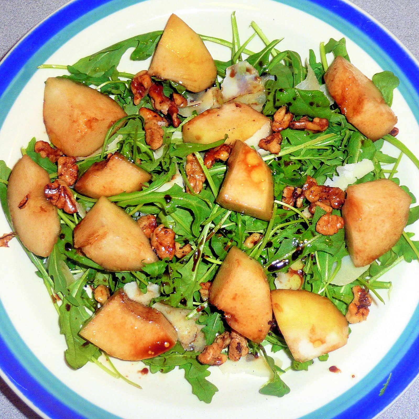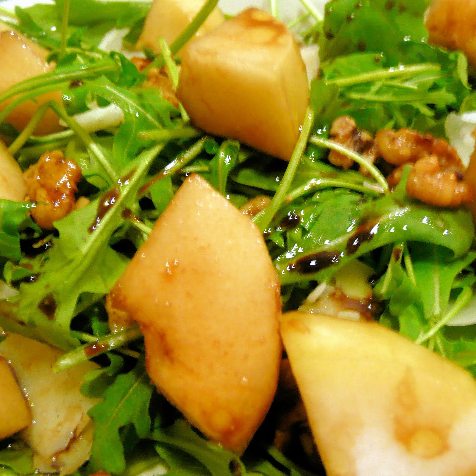 Allow to cool and add to the arugula. Add the cheese. After 20 minutes, add the pear pieces.