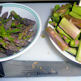 - Prepare the asparagus. Remove the rough bottoms of the stems. Asparagus tends to snap where the tougher part ends, or you can just cut the asparagus where you think it needs to be trimmed.
