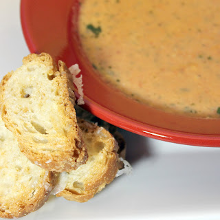 Grilled Cheese and tomato soup is the perfect combination of comfort foods. Rainy, snowy, or just plain crummy days are instantly better after a warm bowl with cheesy bread for dipping. Cooking Light had a quick recipe for Tomato Basil soup in their March issue that sounded so easy I had to try it. (It helped that I had most of the ingredients on hand as well!) The soup is served with toasted bread topped with melted Asiago cheese.