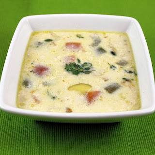 Transfer into a medium saucepan, heated over medium. Pour in 2 cups of stock and puree with immersion blender until smooth. Continue running the blender, adding remaining stock. The soup should have a smooth texture by the time you’re done pureeing. If you don’t have an immersion blender, try using a blender in batches, and then adding pureed veggies into saucepan. Bring soup to a simmer, remove from heat. Season with nutmeg, salt, and pepper. You can even add some chives, if you like.