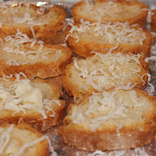 Remove from the oven and rub garlic over the bread pieces. Turn bread over, top with cheese and broil for an additional minute.