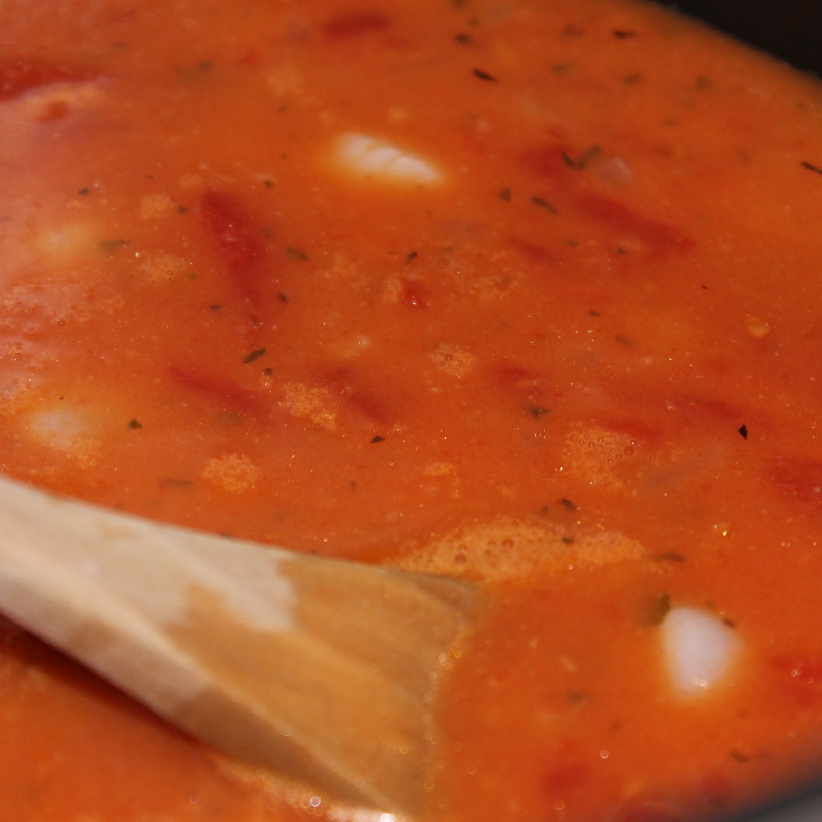 If you do not have an immersion blender, pour the mixture into a normal blender and remove the plastic center from the top. Place a paper towel over the opening and blend until smooth. Be very careful not to burn yourself, the liquid is really hot! Pour back into pot over medium high heat.