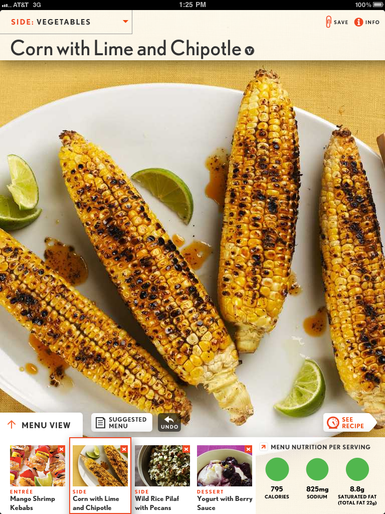 Mango Shrimp Kabobs, Corn with Lime and Chipotle, Wild Rice Pilaf with Pecans, and Yogurt with Berry Sauce. How wonderful does this dinner look? (If you click on the photo above, it will enlarge so you can actually read what it says.) The photo above is a screen shot from the Corn. I received corn as part of my CSA share this week so I was excited to see this recipe. I came across the recipe by scrolling through the “vegetable” sides. I then clicked the “suggested menus” button and that gave me suggestions for a main meal, another side, and a dessert.
