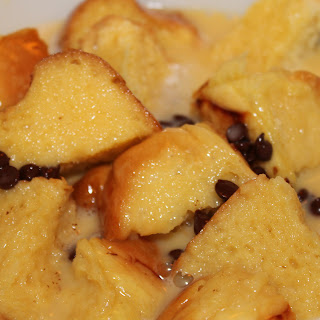 Add the bread cubes and the custard to a large bowl, stirring lightly to coat.  Add the chocolate chips.  Allow to sit for at least a half hour at room temperature. If planning ahead, you can do up to this step the night ahead of time and allow the bread to soak overnight.