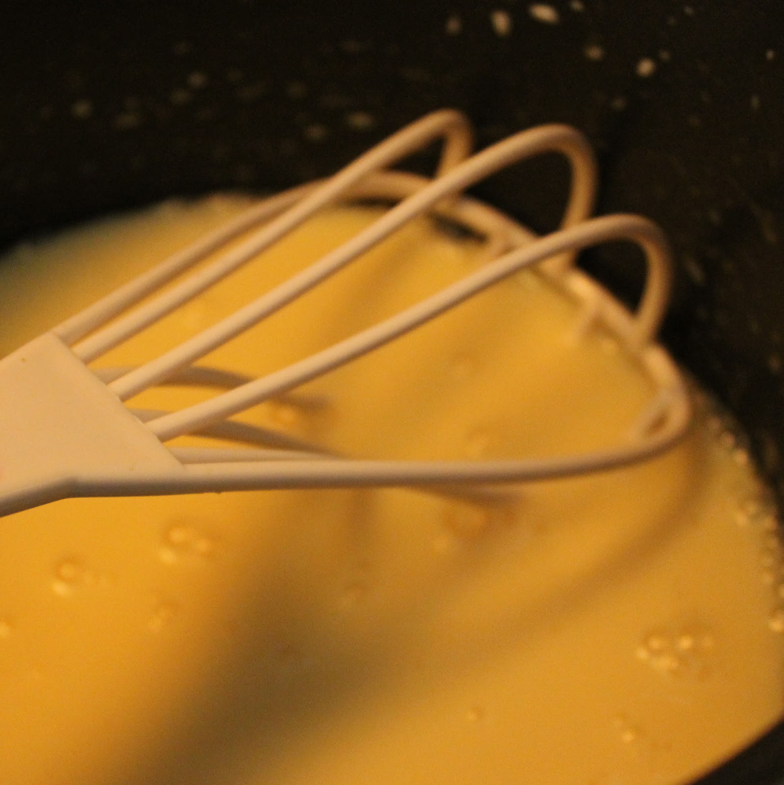 While the pudding is cooking, make the sauce.  Add 1/2 cup cream and the condensed milk to a pot over medium heat.
