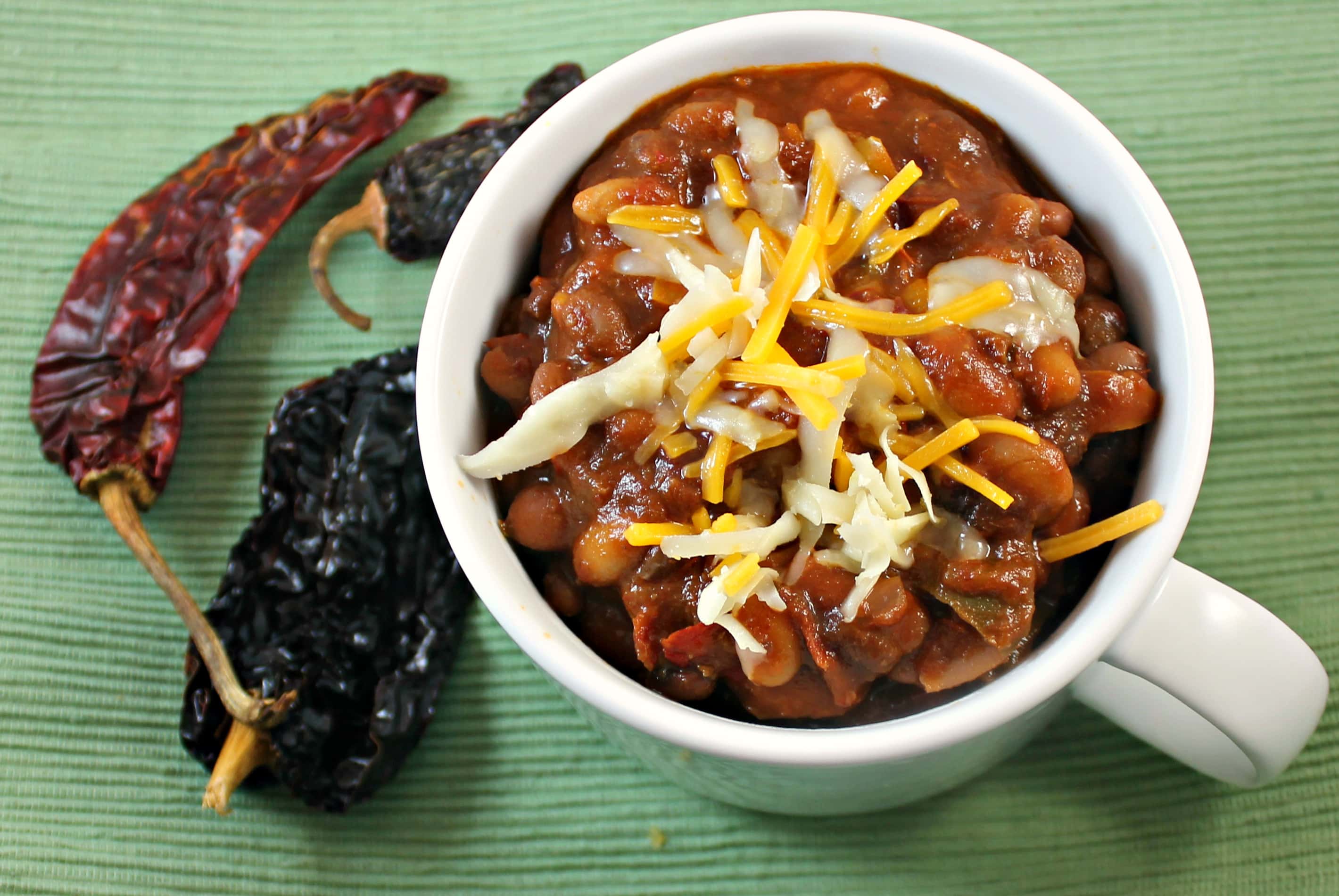 This Tri Vegetarian Chili is aptly named. It uses three types of beans, three types of dried peppers, and three types of bell peppers.