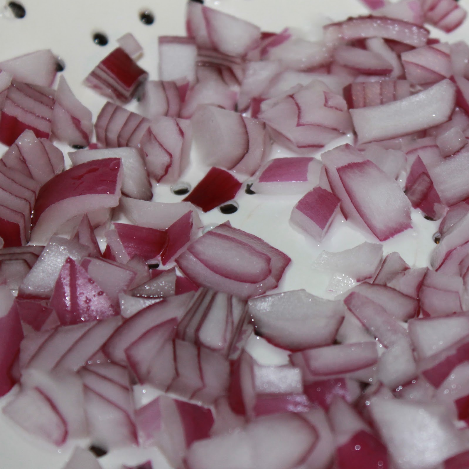 While waiting for the hour to pass, chop your onion, cucumber, and cilantro. Take the chopped onion and rinse with cold water in a colander.