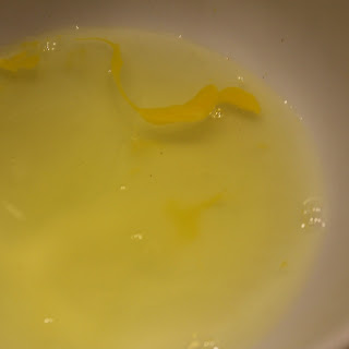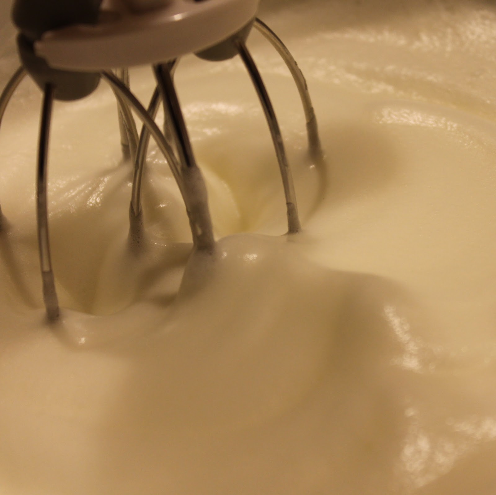 In a medium bowl, add the egg whites (reserve one egg yolk!) and beat using your egg beater until stiff peaks form. This took a good 5 minutes for me.