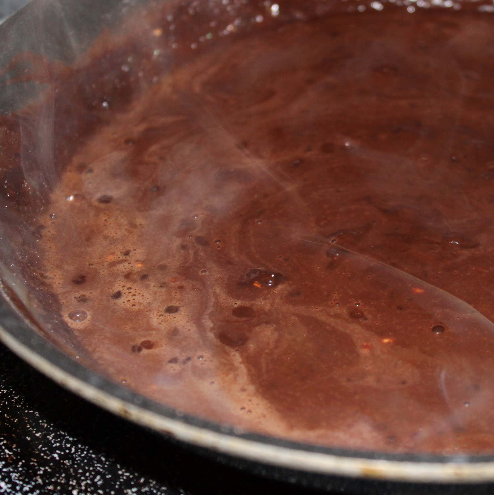 The sauce can also be made ahead of time if you so wish. Melt the butter in a small pot over medium-high heat. Add 1/3 cup sugar, 2 tablespoons cocoa, and 1 tablespoon flour, stirring well with a whisk.