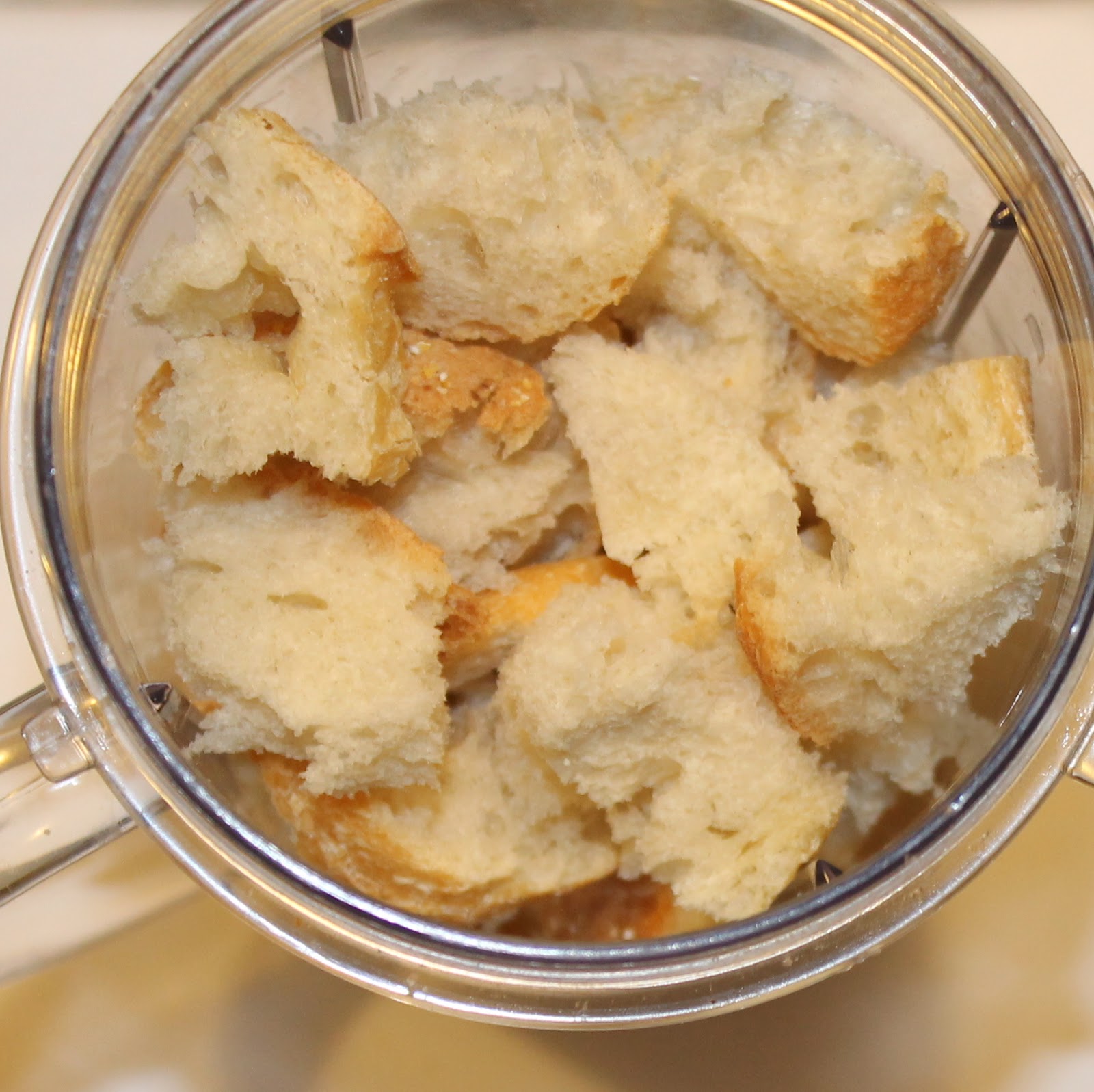 Bring 3 quarts of water to a boil in a large pot. Add the torn bread to a food processor (I just used my Magic Bullet) and process until it becomes coarse crumbs.