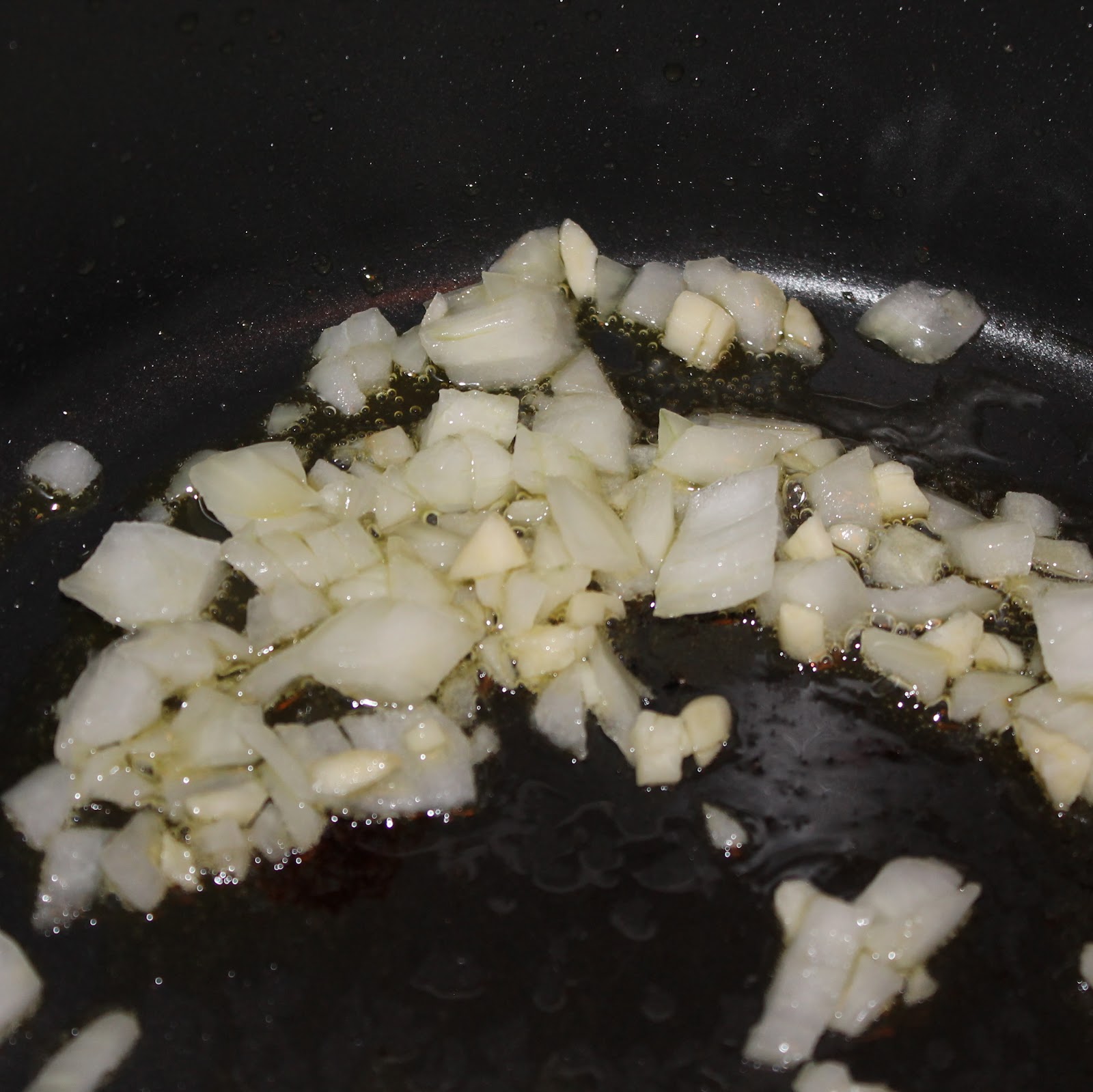 Heat the olive oil in a large pot over medium high heat. Add your onion and garlic to the pot, stirring occasionally. Cook for 4 minutes.