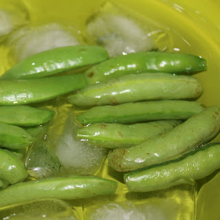 While waiting for the couscous to absorb the water, bring 8 cups of water to a boil in a large pot. Add the peas and cook for 30 seconds. Drain and add to an ice bath to stop the cooking process.