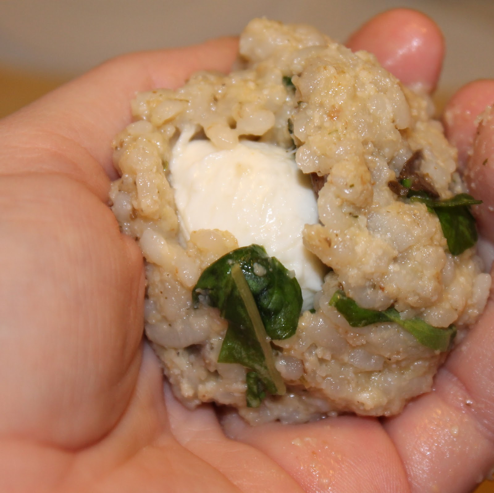 Form the risotto into palm sized balls, adding a mozzarella ball in the center and forming the risotto around the mozzarella ball. (It should make 6 risotto balls)
