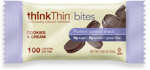 thinkThin® bites are 100 calorie bars with 0g sugar and 5g-8g protein per bar. The bites are also gluten free. Flavors include chocolate toffee nut, cookies and cream, and dark chocolate bites.