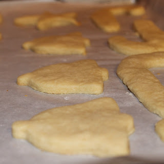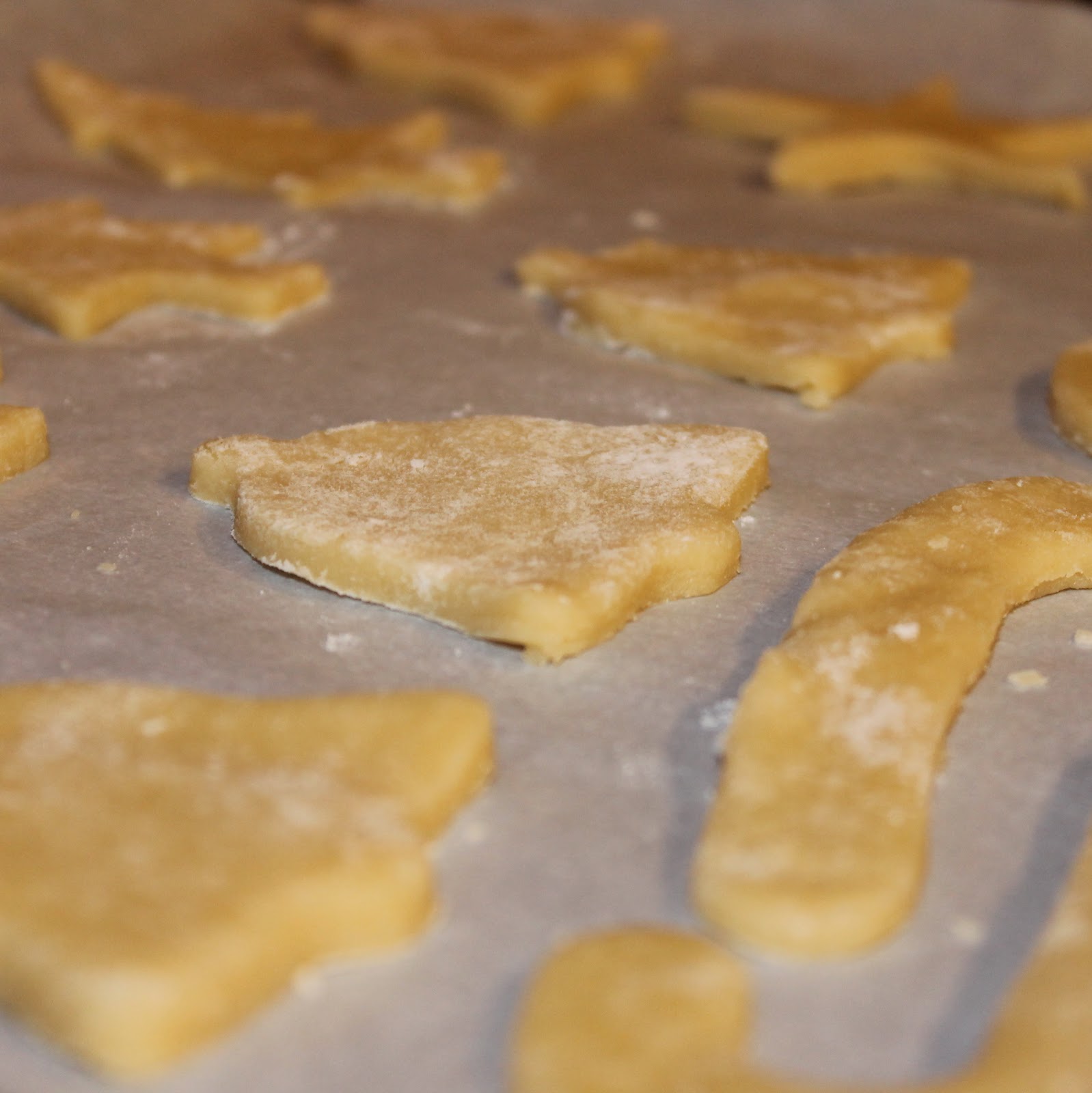 Using any cookie cutter you have, cut out shapes and place on a cookie sheet two inches apart lined with parchment paper.